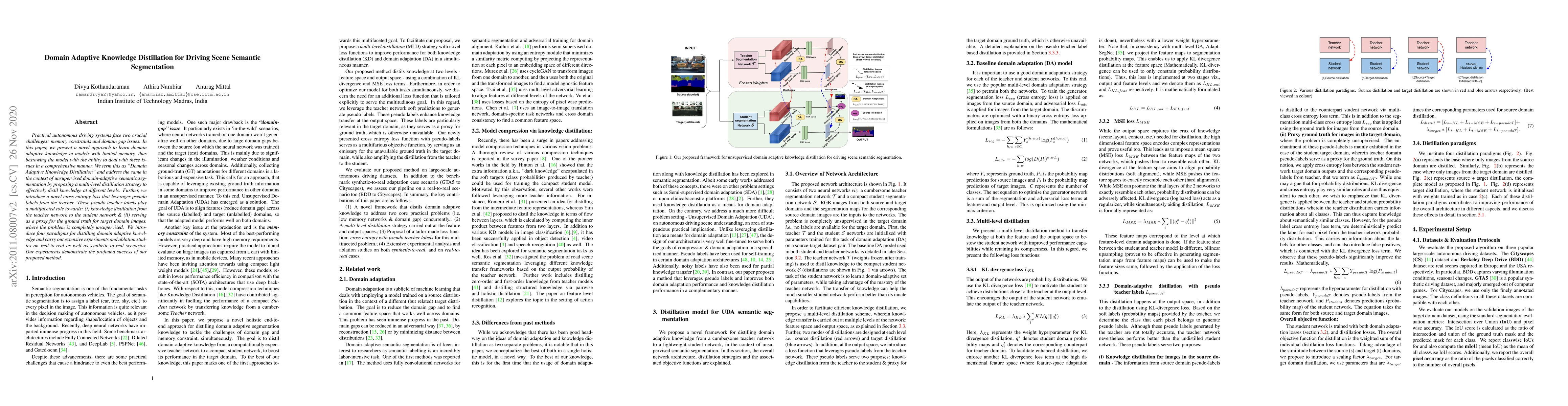 Practical autonomous driving systems face two crucial challenges: memory constraints and domain gap issues. In this paper, we present a novel approach to learn domain adaptive knowledge in models with limited memory, thus bestowing the model with the ability to deal with these issues in a comprehensive manner. We term this as "Domain Adaptive Knowledge Distillation" and address the same in the context of unsupervised domain-adaptive semantic segmentation by proposing a multi-level distillation strategy to effectively distil knowledge at different levels. Further, we introduce a novel cross entropy loss that leverages pseudo labels from the teacher. These pseudo teacher labels play a multifaceted role towards: (i) knowledge distillation from the teacher network to the student network & (ii) serving as a proxy for the ground truth for target domain images, where the problem is completely unsupervised. We introduce four paradigms for distilling domain adaptive knowledge and carry out extensive experiments and ablation studies on real-to-real as well as synthetic-to-real scenarios. Our experiments demonstrate the profound success of our proposed method.