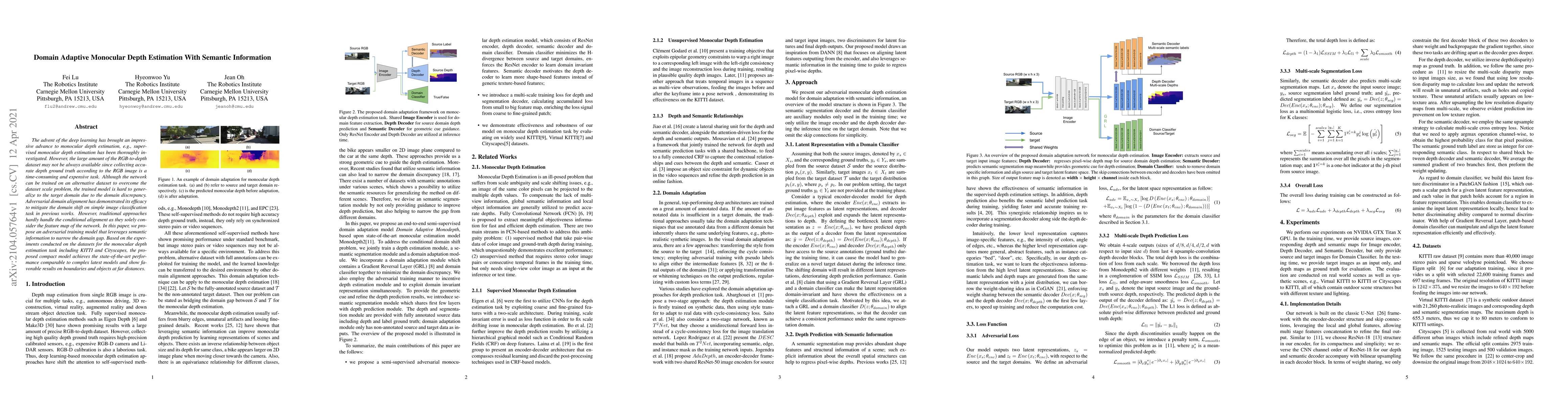 This research is significant as it addresses the monocular depth estimation problem by introducing a compact domain adaptation model that leverages semantic information and adversarial training, improving cross-domain generalization and depth prediction accuracy.