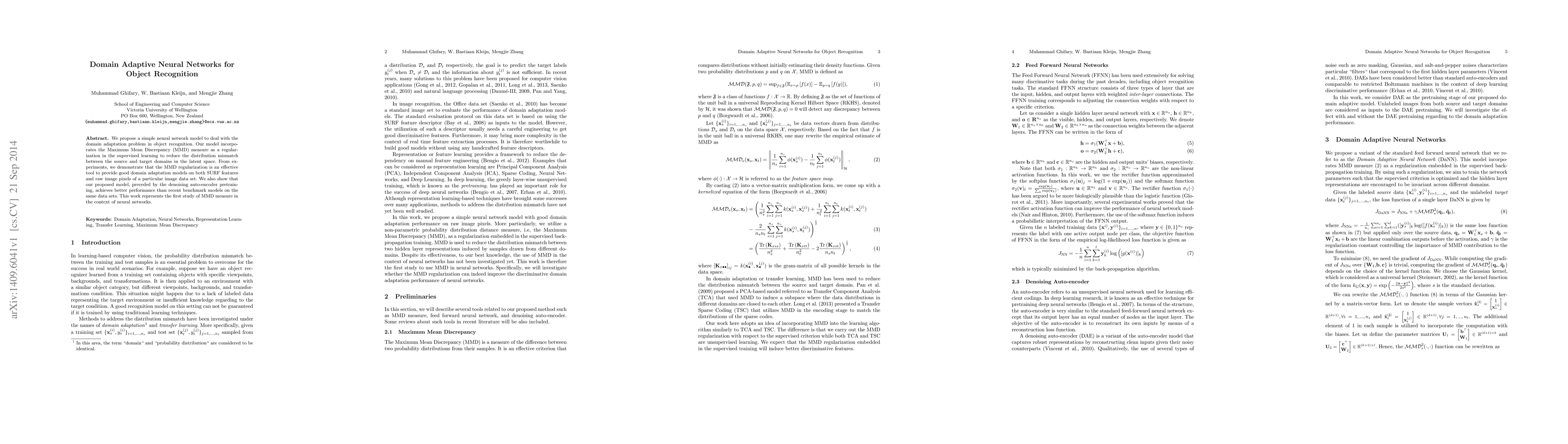 A new neural network model uses Maximum Mean Discrepancy to improve object recognition across different domains. It outperforms recent benchmark models on certain data sets.