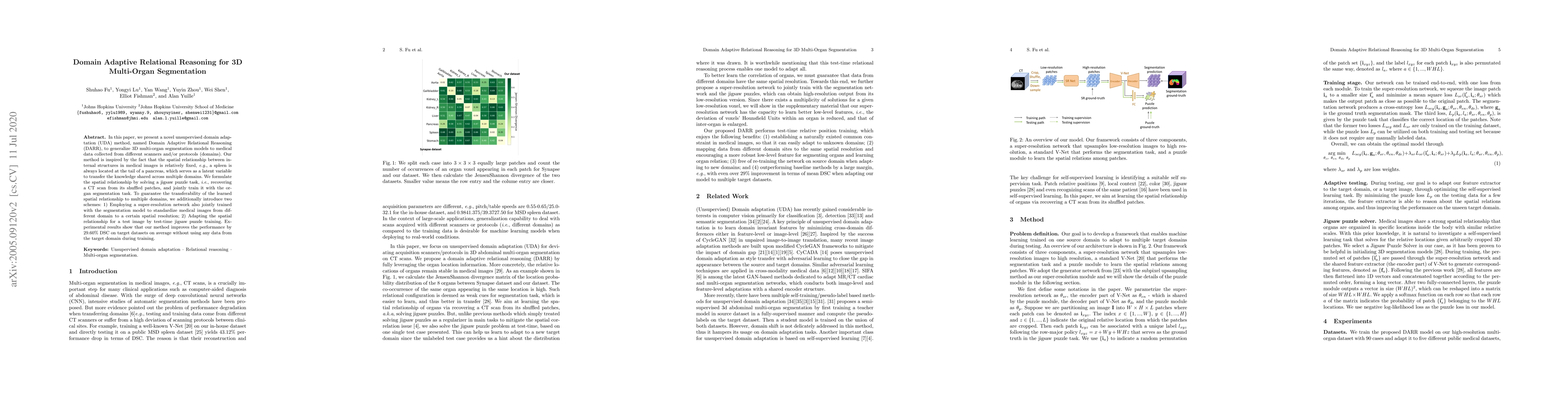 In this paper, we present a novel unsupervised domain adaptation (UDA) method, named Domain Adaptive Relational Reasoning (DARR), to generalize 3D multi-organ segmentation models to medical data collected from different scanners and/or protocols (domains). Our method is inspired by the fact that the spatial relationship between internal structures in medical images is relatively fixed, e.g., a spleen is always located at the tail of a pancreas, which serves as a latent variable to transfer the knowledge shared across multiple domains. We formulate the spatial relationship by solving a jigsaw puzzle task, i.e., recovering a CT scan from its shuffled patches, and jointly train it with the organ segmentation task. To guarantee the transferability of the learned spatial relationship to multiple domains, we additionally introduce two schemes: 1) Employing a super-resolution network also jointly trained with the segmentation model to standardize medical images from different domain to a certain spatial resolution; 2) Adapting the spatial relationship for a test image by test-time jigsaw puzzle training. Experimental results show that our method improves the performance by 29.60% DSC on target datasets on average without using any data from the target domain during training.