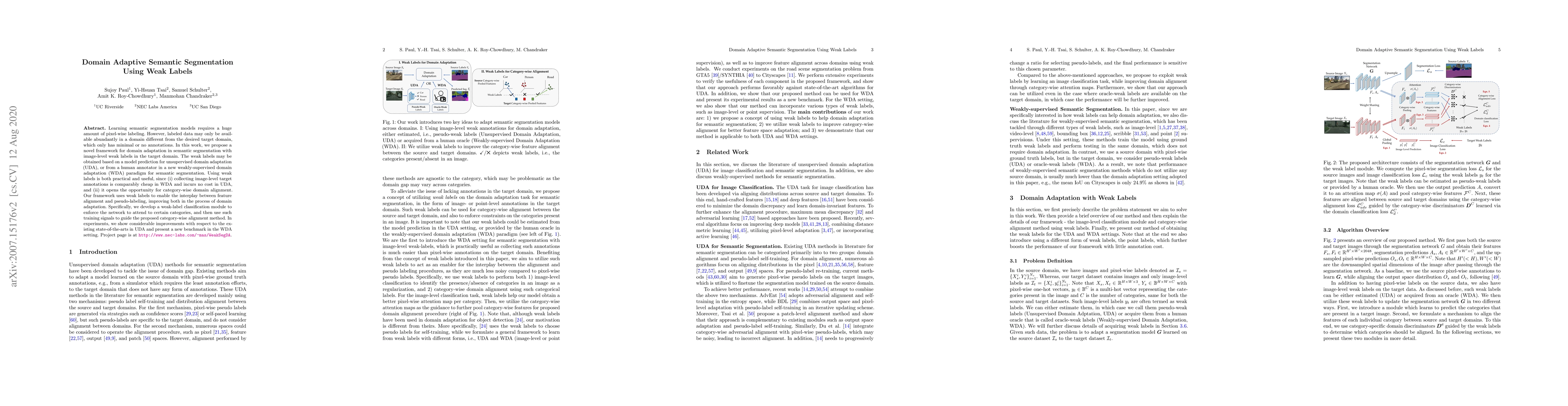 This paper proposes a framework for domain adaptive semantic segmentation using image-level weak labels, enabling effective adaptation from a source to a target domain with minimal or no pixel-wise annotations. It combines feature alignment and pseudo-labeling to improve domain adaptation, showing significant improvements over existing methods in both unsupervised and weakly-supervised settings.