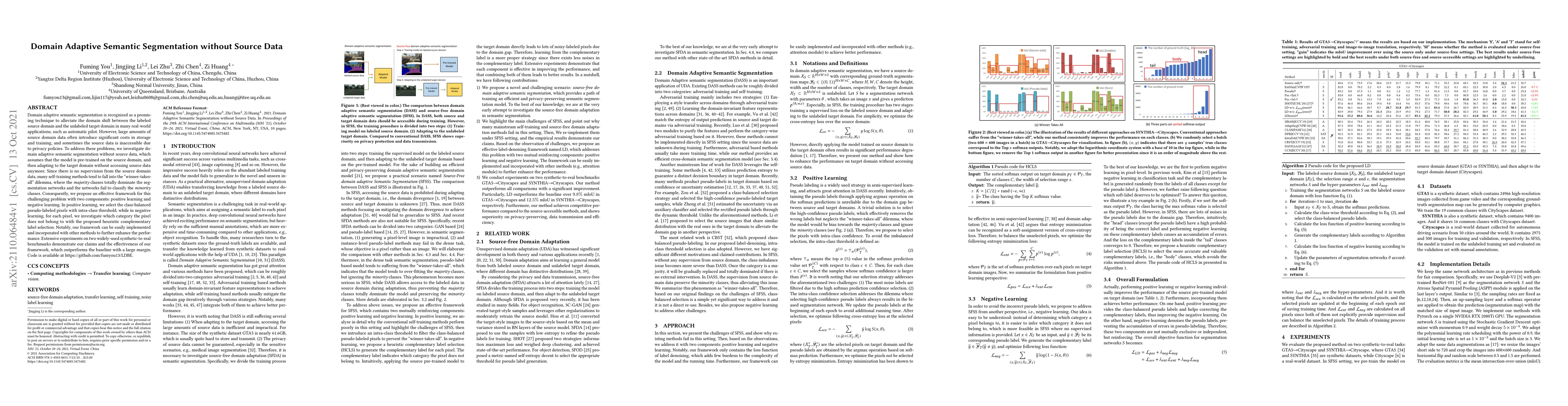 This paper proposes a framework for domain adaptive semantic segmentation without requiring source data, addressing the challenge of domain shift between labeled source and unlabeled target domains. The method employs positive and negative learning to balance class representation and improve minority class classification, achieving superior performance on synthetic-to-real benchmarks.