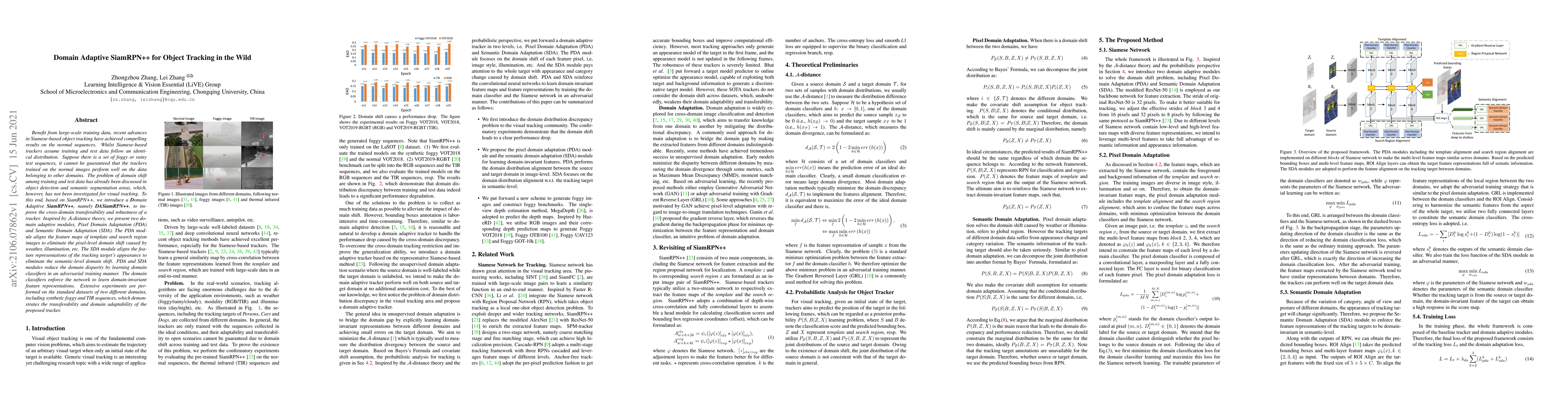 Benefit from large-scale training data, recent advances in Siamese-based object tracking have achieved compelling results on the normal sequences. Whilst Siamese-based trackers assume training and test data follow an identical distribution. Suppose there is a set of foggy or rainy test sequences, it cannot be guaranteed that the trackers trained on the normal images perform well on the data belonging to other domains. The problem of domain shift among training and test data has already been discussed in object detection and semantic segmentation areas, which, however, has not been investigated for visual tracking. To this end, based on SiamRPN++, we introduce a Domain Adaptive SiamRPN++, namely DASiamRPN++, to improve the cross-domain transferability and robustness of a tracker. Inspired by A-distance theory, we present two domain adaptive modules, Pixel Domain Adaptation (PDA) and Semantic Domain Adaptation (SDA). The PDA module aligns the feature maps of template and search region images to eliminate the pixel-level domain shift caused by weather, illumination, etc. The SDA module aligns the feature representations of the tracking target's appearance to eliminate the semantic-level domain shift. PDA and SDA modules reduce the domain disparity by learning domain classifiers in an adversarial training manner. The domain classifiers enforce the network to learn domain-invariant feature representations. Extensive experiments are performed on the standard datasets of two different domains, including synthetic foggy and TIR sequences, which demonstrate the transferability and domain adaptability of the proposed tracker.
