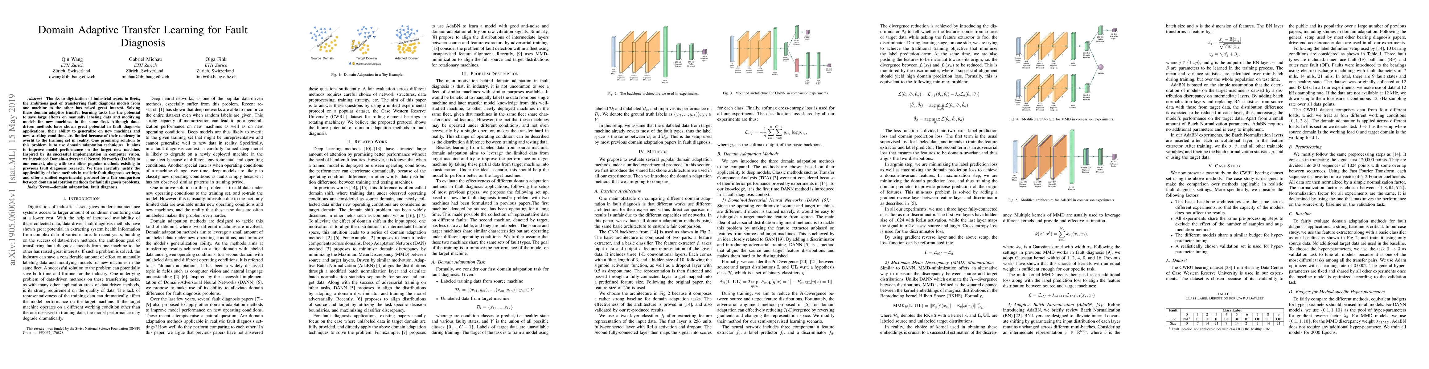 Thanks to digitization of industrial assets in fleets, the ambitious goal of transferring fault diagnosis models fromone machine to the other has raised great interest. Solving these domain adaptive transfer learning tasks has the potential to save large efforts on manually labeling data and modifying models for new machines in the same fleet. Although data-driven methods have shown great potential in fault diagnosis applications, their ability to generalize on new machines and new working conditions are limited because of their tendency to overfit to the training set in reality. One promising solution to this problem is to use domain adaptation techniques. It aims to improve model performance on the target new machine. Inspired by its successful implementation in computer vision, we introduced Domain-Adversarial Neural Networks (DANN) to our context, along with two other popular methods existing in previous fault diagnosis research. We then carefully justify the applicability of these methods in realistic fault diagnosis settings, and offer a unified experimental protocol for a fair comparison between domain adaptation methods for fault diagnosis problems.
