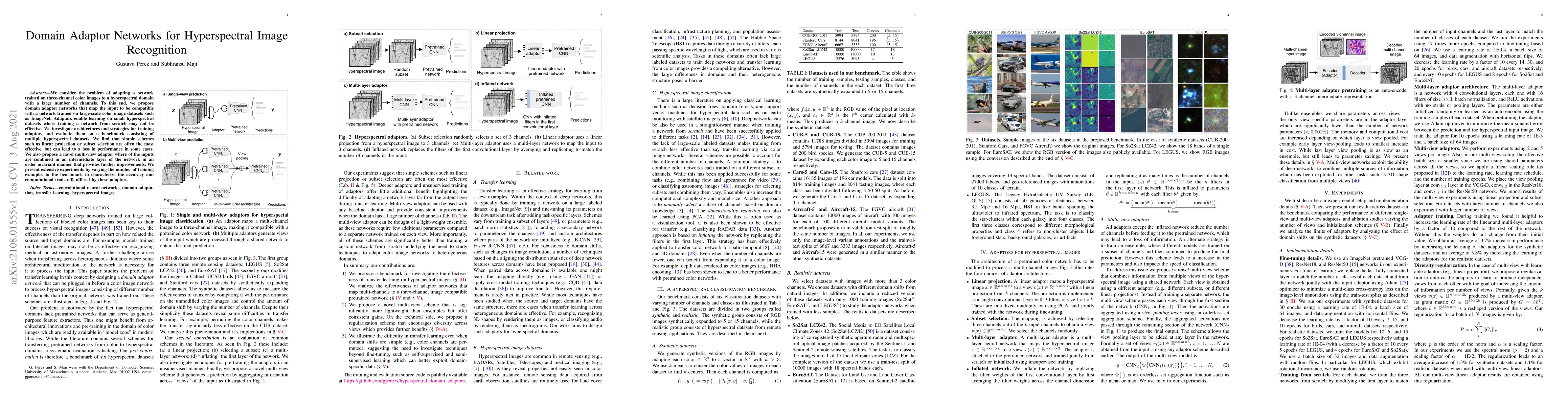 We consider the problem of adapting a network trained on three-channel color images to a hyperspectral domain with a large number of channels. To this end, we propose domain adaptor networks that map the input to be compatible with a network trained on large-scale color image datasets such as ImageNet. Adaptors enable learning on small hyperspectral datasets where training a network from scratch may not be effective. We investigate architectures and strategies for training adaptors and evaluate them on a benchmark consisting of multiple hyperspectral datasets. We find that simple schemes such as linear projection or subset selection are often the most effective, but can lead to a loss in performance in some cases. We also propose a novel multi-view adaptor where of the inputs are combined in an intermediate layer of the network in an order invariant manner that provides further improvements. We present extensive experiments by varying the number of training examples in the benchmark to characterize the accuracy and computational trade-offs offered by these adaptors.