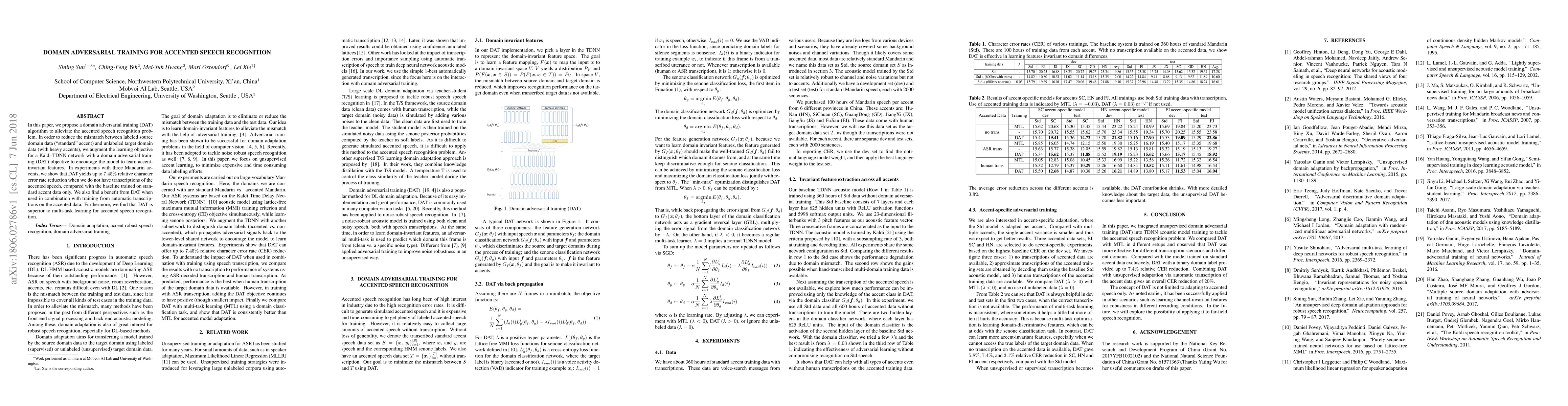 This paper introduces a domain adversarial training (DAT) method to improve recognition of speech with heavy accents. The approach reduces the performance gap between standard and accented speech by encouraging the model to learn accent-invariant features, resulting in a significant reduction in character error rates for Mandarin accents.