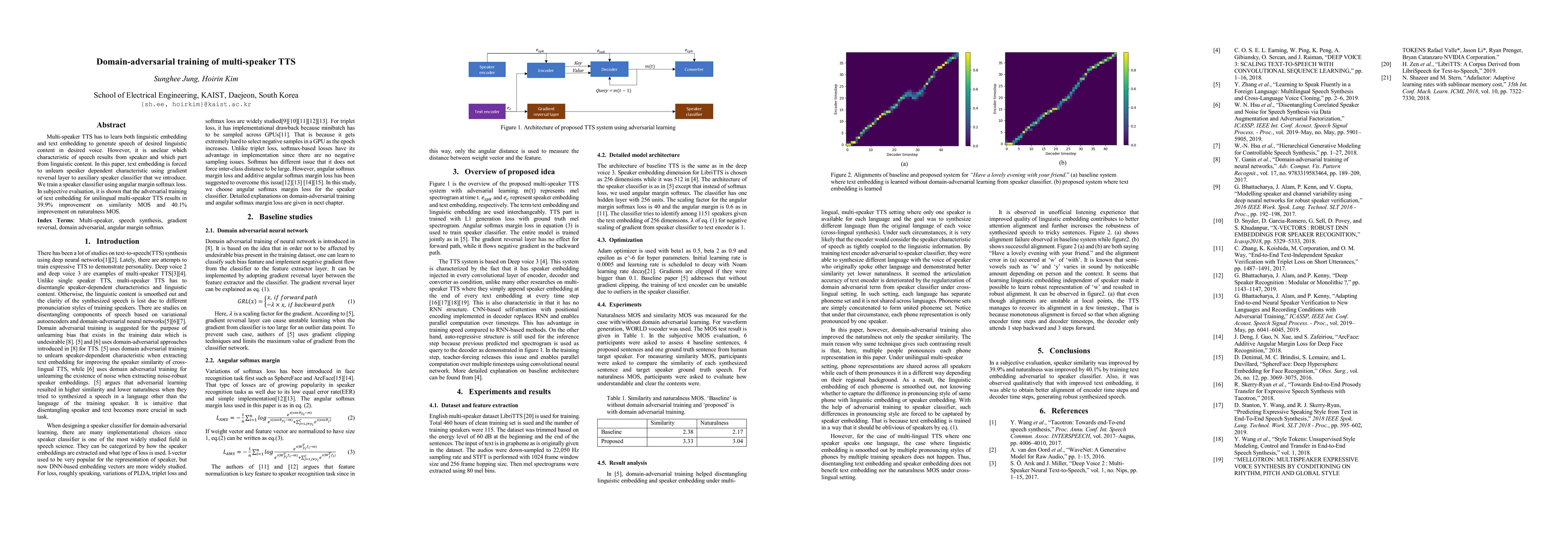 Multi-speaker TTS has to learn both linguistic embedding and text embedding to generate speech of desired linguistic content in desired voice. However, it is unclear which characteristic of speech results from speaker and which part from linguistic content. In this paper, text embedding is forced to unlearn speaker dependent characteristic using gradient reversal layer to auxiliary speaker classifier that we introduce. We train a speaker classifier using angular margin softmax loss. In subjective evaluation, it is shown that the adversarial training of text embedding for unilingual multi-speaker TTS results in 39.9% improvement on similarity MOS and 40.1% improvement on naturalness MOS.