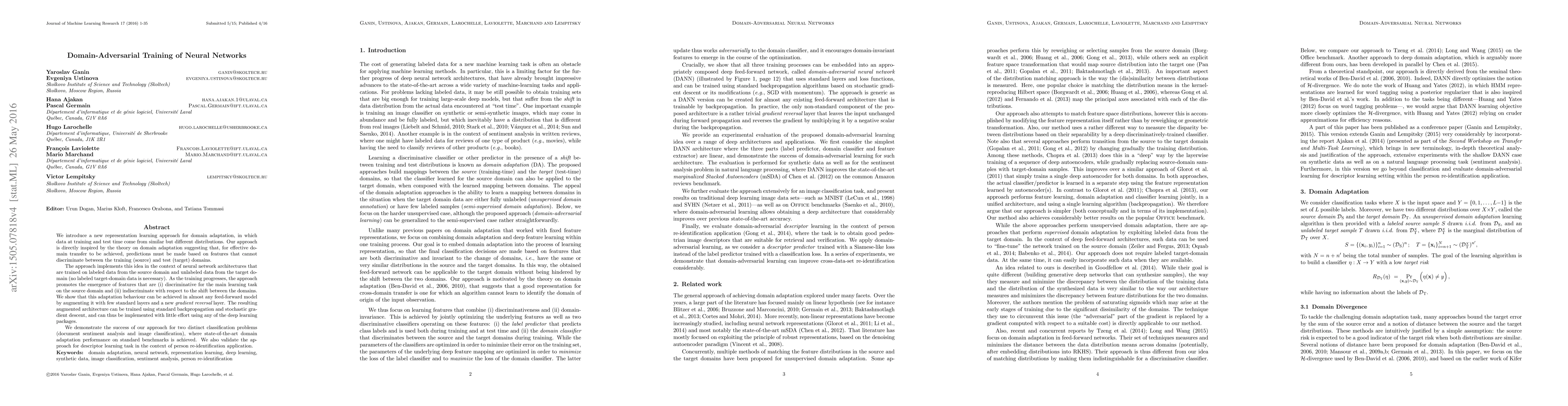 We introduce a new representation learning approach for domain adaptation, in which data at training and test time come from similar but different distributions. Our approach is directly inspired by the theory on domain adaptation suggesting that, for effective domain transfer to be achieved, predictions must be made based on features that cannot discriminate between the training (source) and test (target) domains. The approach implements this idea in the context of neural network architectures that are trained on labeled data from the source domain and unlabeled data from the target domain (no labeled target-domain data is necessary). As the training progresses, the approach promotes the emergence of features that are (i) discriminative for the main learning task on the source domain and (ii) indiscriminate with respect to the shift between the domains. We show that this adaptation behaviour can be achieved in almost any feed-forward model by augmenting it with few standard layers and a new gradient reversal layer. The resulting augmented architecture can be trained using standard backpropagation and stochastic gradient descent, and can thus be implemented with little effort using any of the deep learning packages. We demonstrate the success of our approach for two distinct classification problems (document sentiment analysis and image classification), where state-of-the-art domain adaptation performance on standard benchmarks is achieved. We also validate the approach for descriptor learning task in the context of person re-identification application.