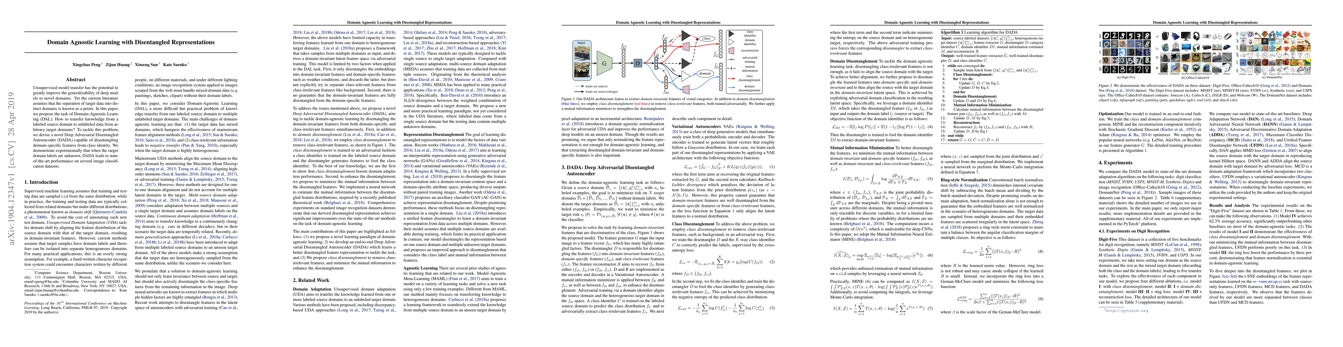 Unsupervised model transfer has the potential to greatly improve the generalizability of deep models to novel domains. Yet the current literature assumes that the separation of target data into distinct domains is known as a priori. In this paper, we propose the task of Domain-Agnostic Learning (DAL): How to transfer knowledge from a labeled source domain to unlabeled data from arbitrary target domains? To tackle this problem, we devise a novel Deep Adversarial Disentangled Autoencoder (DADA) capable of disentangling domain-specific features from class identity. We demonstrate experimentally that when the target domain labels are unknown, DADA leads to state-of-the-art performance on several image classification datasets.