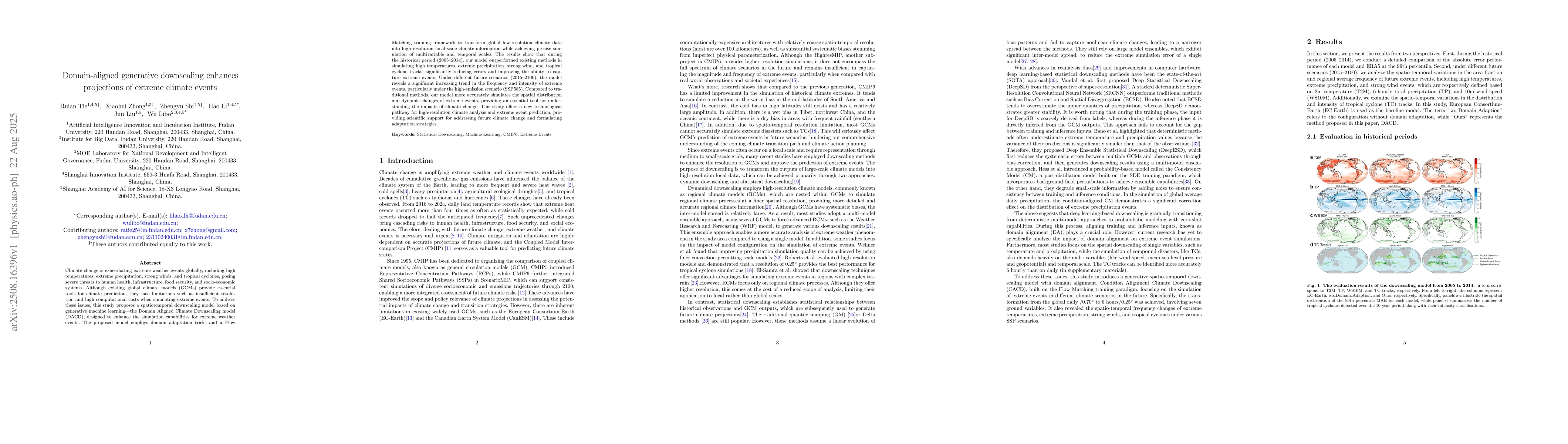 Climate change is exacerbating extreme weather events globally, including high temperatures, extreme precipitation, strong winds, and tropical cyclones, posing severe threats to human health, infrastructure, food security, and socio-economic systems. Although existing global climate models (GCMs) provide essential tools for climate prediction, they face limitations such as insufficient resolution and high computational costs when simulating extreme events. To address these issues, this study proposes a spatiotemporal downscaling model based on generative machine learning-the Domain Aligned Climate Downscaling model (DACD), designed to enhance the simulation capabilities for extreme weather events. The proposed model employs domain adaptation tricks and a Flow Matching training framework to transform global low-resolution climate data into high-resolution local-scale climate information while achieving precise simulation of multivariable and temporal scales. The results show that during the historical period (2005-2014), our model outperformed existing methods in simulating high temperatures, extreme precipitation, strong wind, and tropical cyclone tracks, significantly reducing errors and improving the ability to capture extreme events. Under different future scenarios (2015-2100), the model reveals a significant increasing trend in the frequency and intensity of extreme events, particularly under the high-emission scenario (SSP585). Compared to traditional methods, our model more accurately simulates the spatial distribution and dynamic changes of extreme events, providing an essential tool for understanding the impacts of climate change. This study offers a new technological pathway for high-resolution climate analysis and extreme event prediction, providing scientific support for addressing future climate change and formulating adaptation strategies.