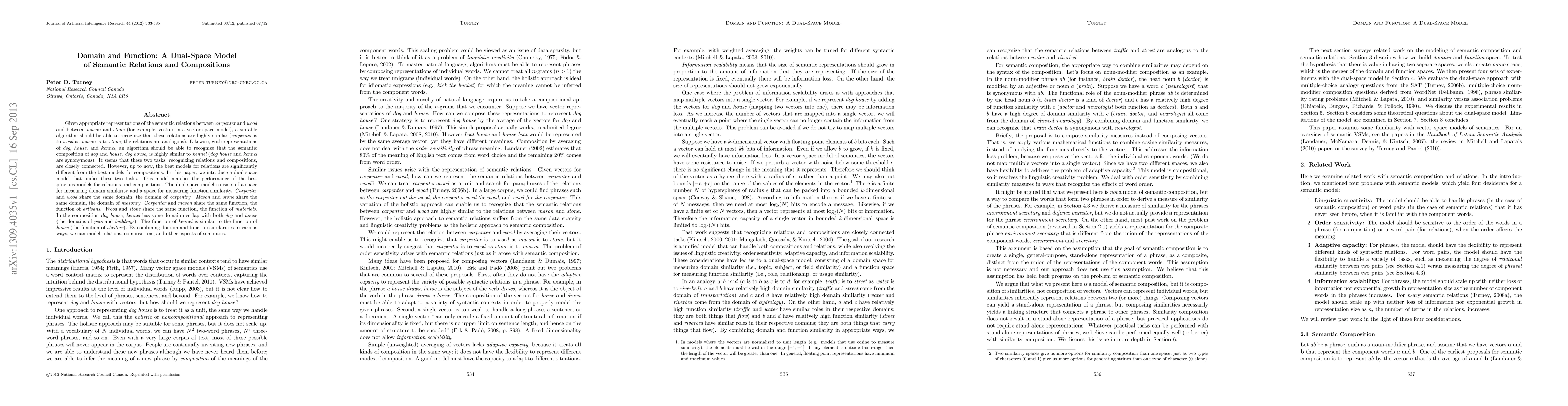 Given appropriate representations of the semantic relations between carpenter and wood and between mason and stone (for example, vectors in a vector space model), a suitable algorithm should be able to recognize that these relations are highly similar (carpenter is to wood as mason is to stone; the relations are analogous). Likewise, with representations of dog, house, and kennel, an algorithm should be able to recognize that the semantic composition of dog and house, dog house, is highly similar to kennel (dog house and kennel are synonymous). It seems that these two tasks, recognizing relations and compositions, are closely connected. However, up to now, the best models for relations are significantly different from the best models for compositions. In this paper, we introduce a dual-space model that unifies these two tasks. This model matches the performance of the best previous models for relations and compositions. The dual-space model consists of a space for measuring domain similarity and a space for measuring function similarity. Carpenter and wood share the same domain, the domain of carpentry. Mason and stone share the same domain, the domain of masonry. Carpenter and mason share the same function, the function of artisans. Wood and stone share the same function, the function of materials. In the composition dog house, kennel has some domain overlap with both dog and house (the domains of pets and buildings). The function of kennel is similar to the function of house (the function of shelters). By combining domain and function similarities in various ways, we can model relations, compositions, and other aspects of semantics.