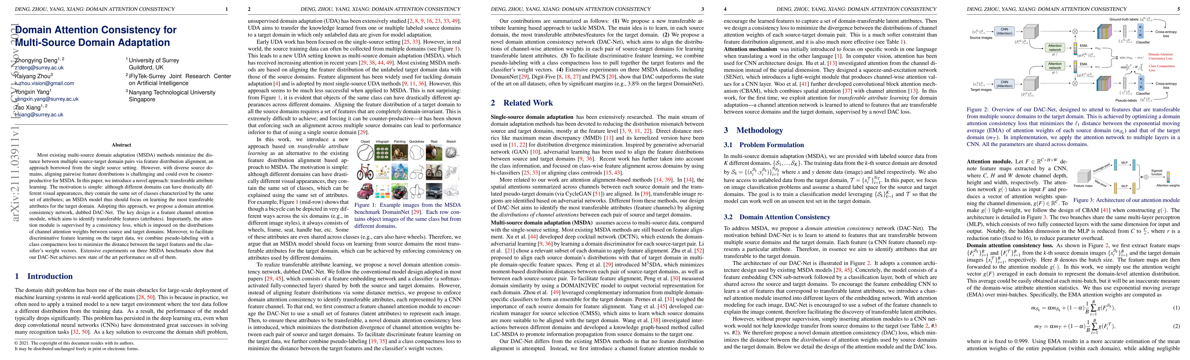 The paper introduces Domain Attention Consistency Network (DAC-Net) for multi-source domain adaptation (MSDA), focusing on learning transferable latent attributes by employing a domain attention consistency loss and a class compactness loss. DAC-Net uses a feature channel attention module supervised by a consistency loss on attention weights between source and target domains, combined with pseudo-labeling and a class compactness loss.