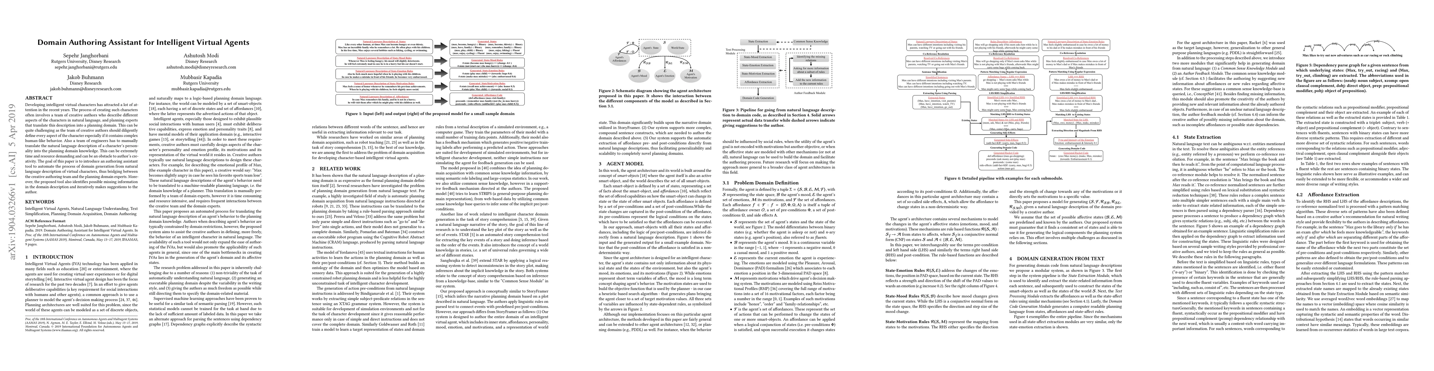 This paper introduces an authoring assistant tool to automate the generation of planning domains from natural language descriptions of intelligent virtual characters, aiming to bridge the gap between creative authors and planning experts. It also identifies missing information and suggests improvements, thereby reducing the manual effort and resource demands.