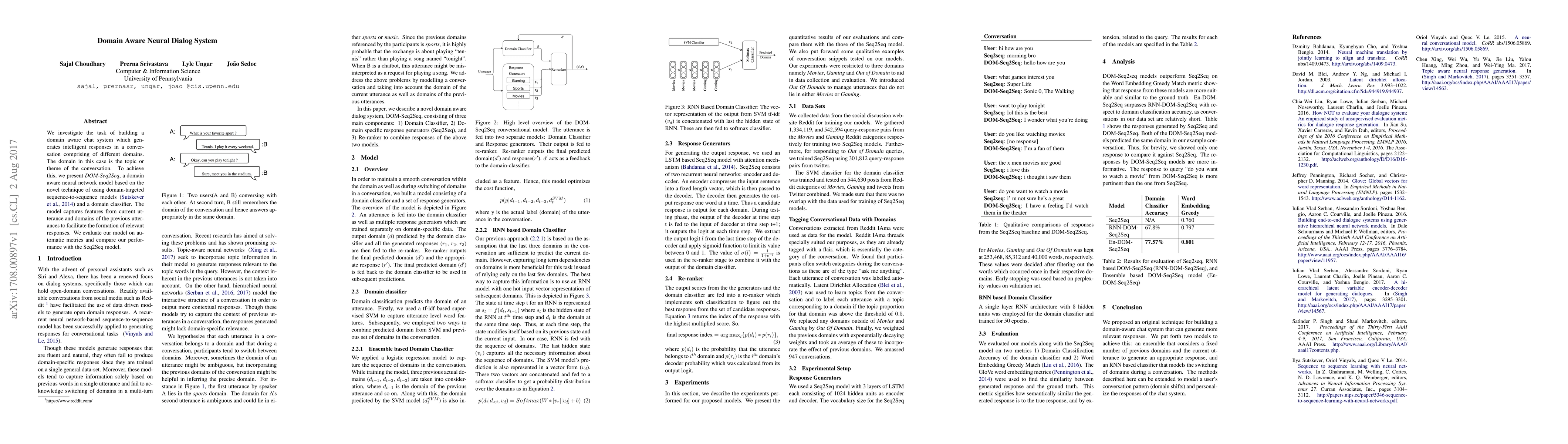 This paper proposes DOM-Seq2Seq, a domain aware neural dialog system that uses domain-targeted sequence-to-sequence models and a domain classifier to generate relevant responses based on conversation topics. The model's performance is evaluated and compared against standard Seq2Seq models.