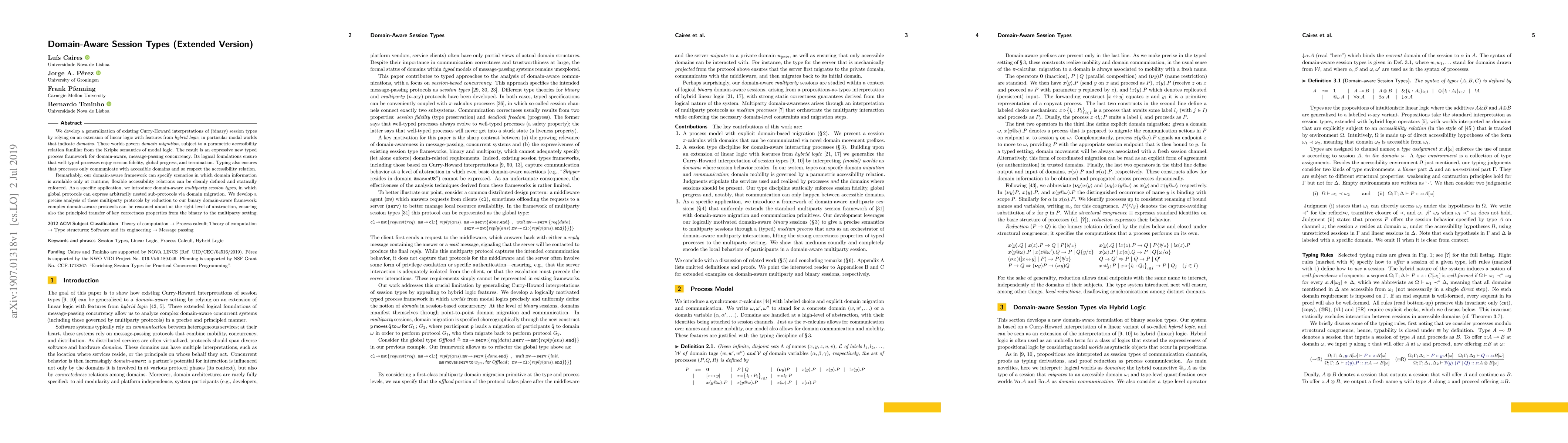 This paper extends Curry-Howard interpretations of session types using linear logic and hybrid logic features to create a new domain-aware typed process framework ensuring session fidelity, global progress, and termination. It introduces domain-aware multiparty session types for nested sub-protocols and analyzes them via reduction to the binary framework.