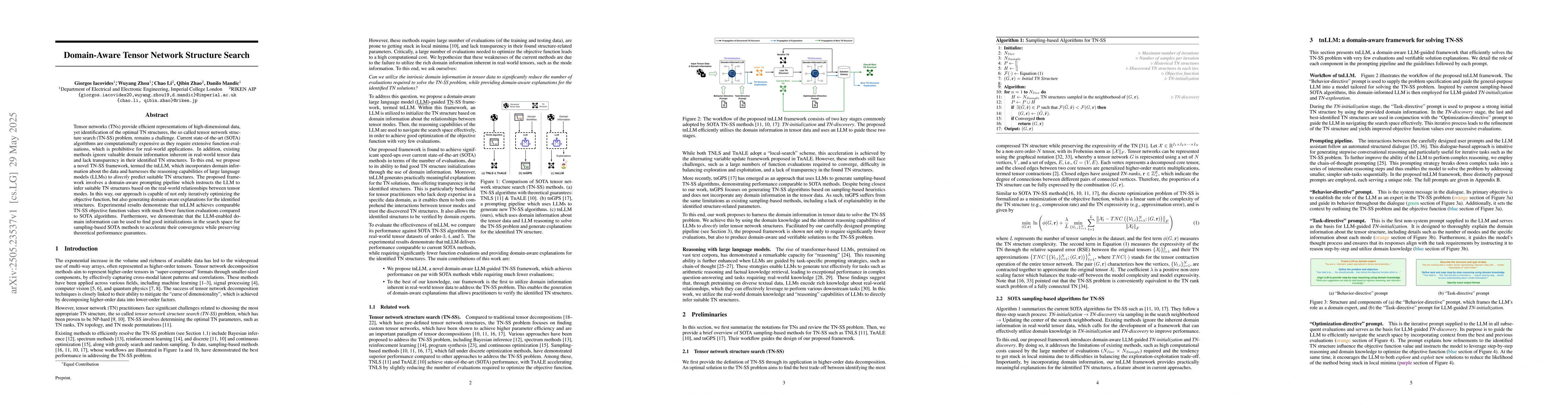 This paper proposes a novel framework, tnLLM, that uses large language models to search for optimal tensor network structures, reducing computational costs and providing domain-aware explanations.