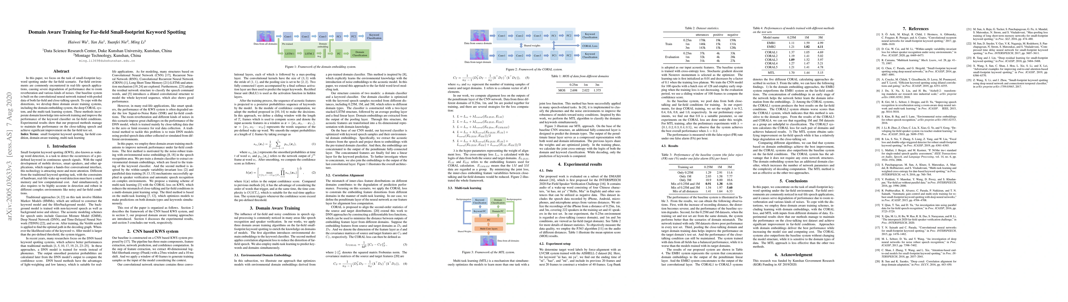 This paper proposes domain aware training methods to enhance small-footprint keyword spotting in far-field scenarios, addressing performance degradation due to reverberation and noise. The developed systems, including domain embedding, deep CORAL, and multi-task learning, significantly improve far-field performance while maintaining close-talking speech accuracy.