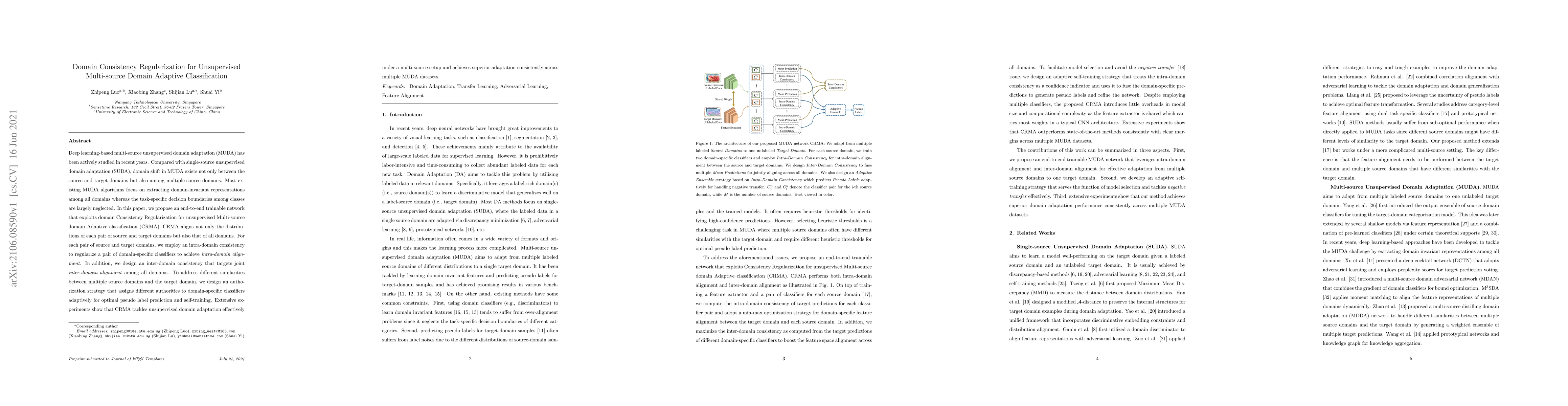The paper proposes CRMA, an end-to-end trainable network for unsupervised multi-source domain adaptive classification, which aligns intra-domain and inter-domain distributions using consistency regularization and adaptive self-training.