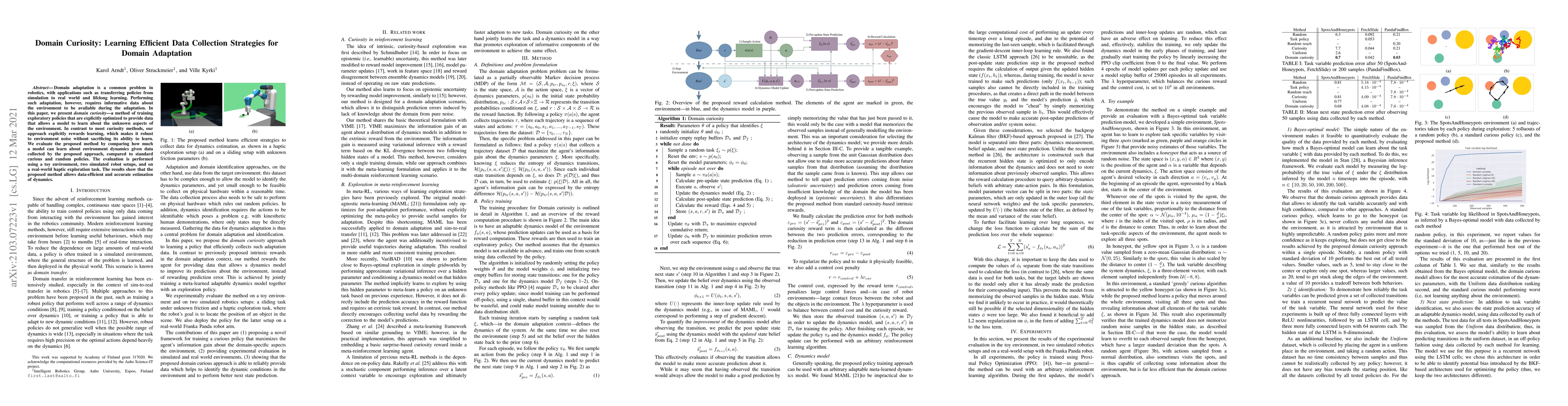 This paper introduces Domain Curiosity, a method that trains exploratory policies to collect informative data for efficient domain adaptation in robotics. It shows that the proposed approach allows for accurate estimation of dynamics with data-efficient collection strategies.