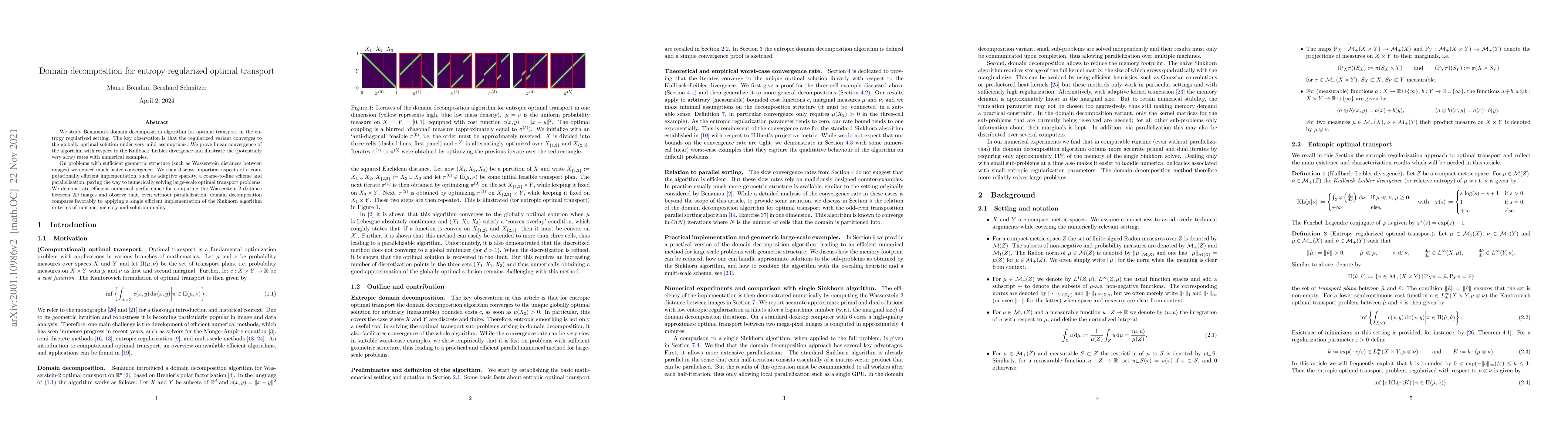 This paper investigates Benamou's domain decomposition algorithm for entropy-regularized optimal transport, demonstrating its linear convergence and efficient computational strategies. The method is shown to perform favorably against the Sinkhorn algorithm, especially when parallelized, for large-scale problems like computing Wasserstein-2 distances between 2D images.