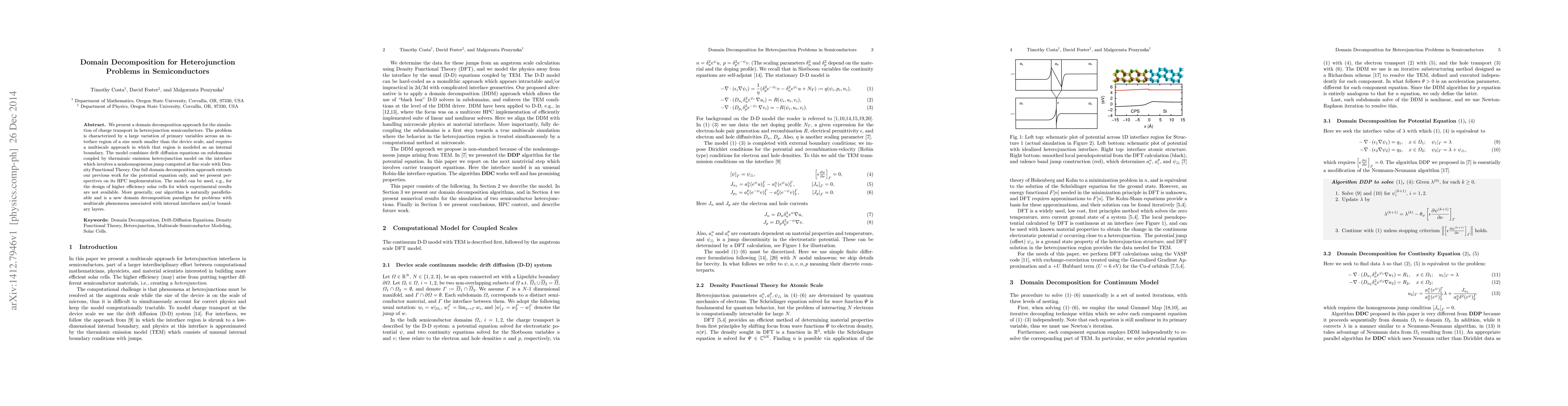 We present a domain decomposition approach for the simulation of charge transport in heterojunction semiconductors. The problem is characterized by a large variation of primary variables across an interface region of a size much smaller than the device scale, and requires a multiscale approach in which that region is modeled as an internal boundary. The model combines drift diffusion equations on subdomains coupled by thermionic emission heterojunction model on the interface which involves a nonhomogeneous jump computed at fine scale with Density Functional Theory. Our full domain decomposition approach extends our previous work for the potential equation only, and we present perspectives on its HPC implementation. The model can be used, e.g., for the design of higher efficiency solar cells for which experimental results are not available. More generally, our algorithm is naturally parallelizable and is a new domain decomposition paradigm for problems with multiscale phenomena associated with internal interfaces and/or boundary layers.