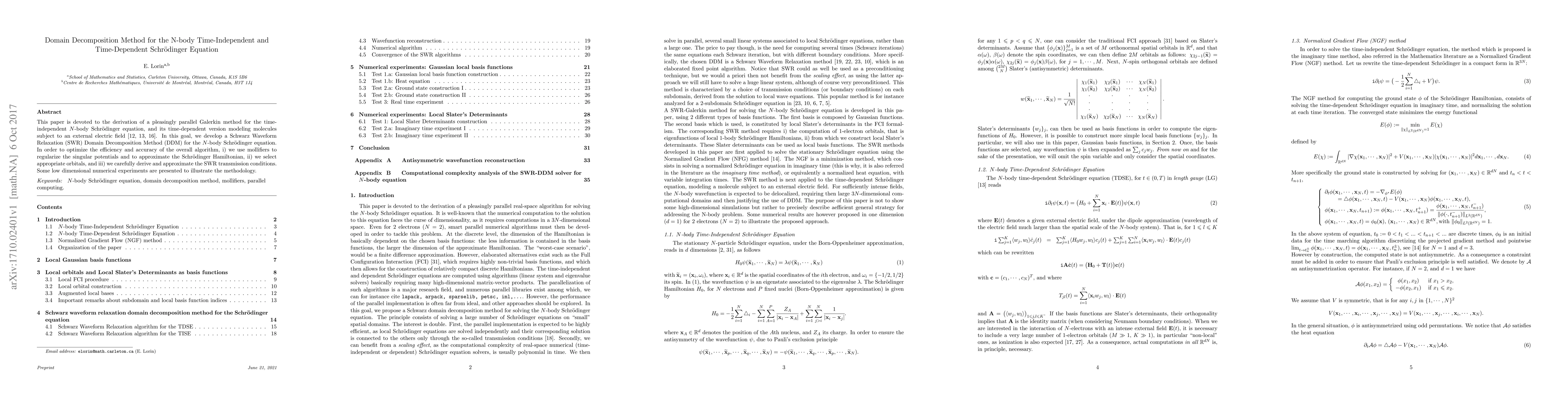 The paper derives a Schwarz Waveform Relaxation (SWR) Domain Decomposition Method (DDM) for the time-independent and time-dependent N-body Schrödinger equation, utilizing mollifiers for regularization, selecting appropriate orbitals, and approximating SWR transmission conditions.