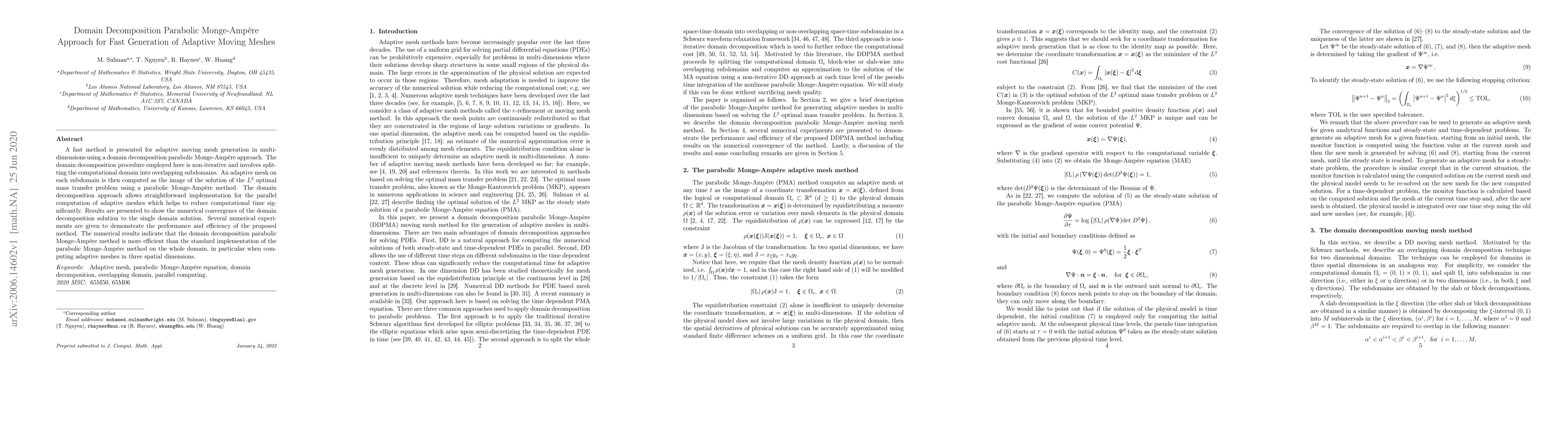 A fast method is presented for adaptive moving mesh generation in multi-dimensions using a domain decomposition parabolic Monge-Amp\`ere approach. The domain decomposition procedure employed here is non-iterative and involves splitting the computational domain into overlapping subdomains. An adaptive mesh on each subdomain is then computed as the image of the solution of the $L^2$ optimal mass transfer problem using a parabolic Monge-Amp\`ere method. The domain decomposition approach allows straightforward implementation for the parallel computation of adaptive meshes which helps to reduce computational time significantly. Results are presented to show the numerical convergence of the domain decomposition solution to the single domain solution. Several numerical experiments are given to demonstrate the performance and efficiency of the proposed method. The numerical results indicate that the domain decomposition parabolic Monge-Amp\`ere method is more efficient than the standard implementation of the parabolic Monge-Amp\`ere method on the whole domain, in particular when computing adaptive meshes in three spatial dimensions.