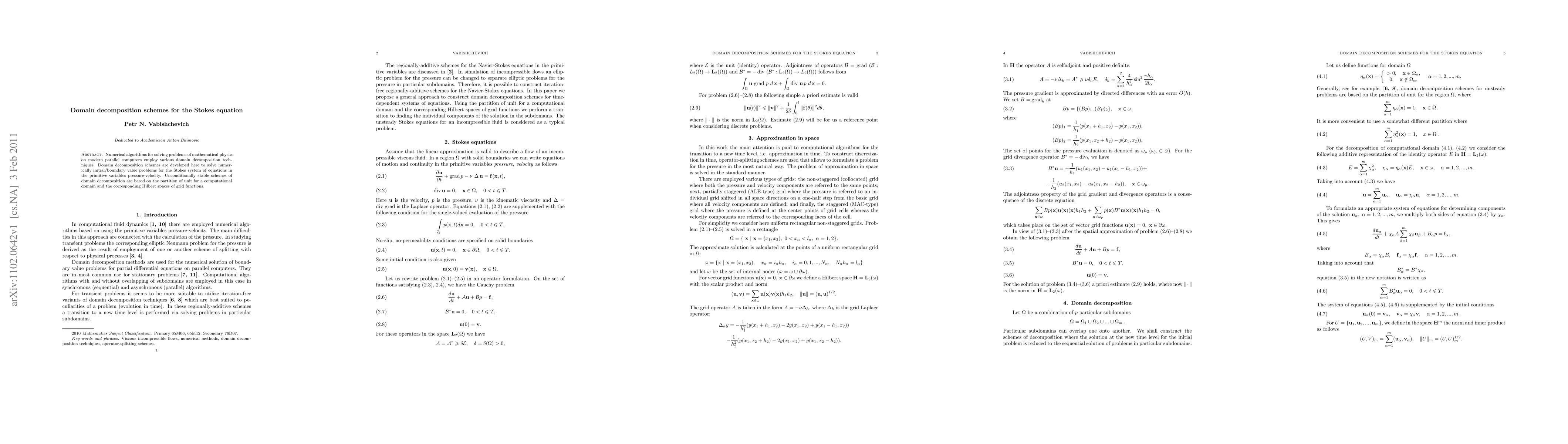 Numerical algorithms for solving problems of mathematical physics on modern parallel computers employ various domain decomposition techniques. Domain decomposition schemes are developed here to solve numerically initial/boundary value problems for the Stokes system of equations in the primitive variables pressure-velocity. Unconditionally stable schemes of domain decomposition are based on the partition of unit for a computational domain and the corresponding Hilbert spaces of grid functions.