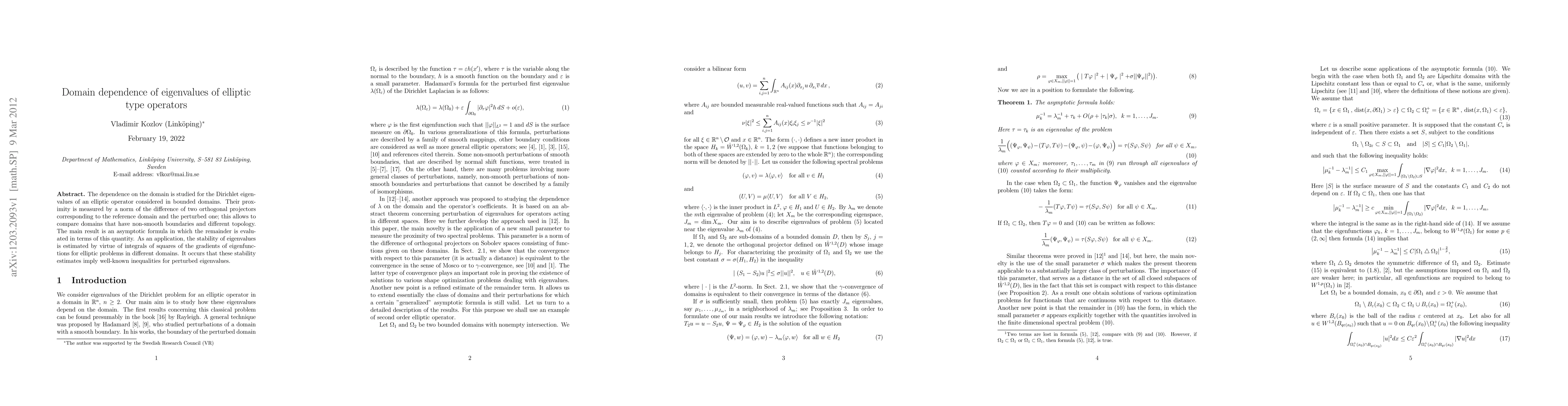 This paper investigates the domain dependence of Dirichlet eigenvalues for elliptic operators in bounded domains, using a norm of the difference of orthogonal projectors to compare non-smooth and topologically different domains. The main result provides an asymptotic formula for the remainder, and the stability of eigenvalues is estimated via integrals of squares of eigenfunctions' gradients, leading to known inequalities for perturbed eigenvalues.