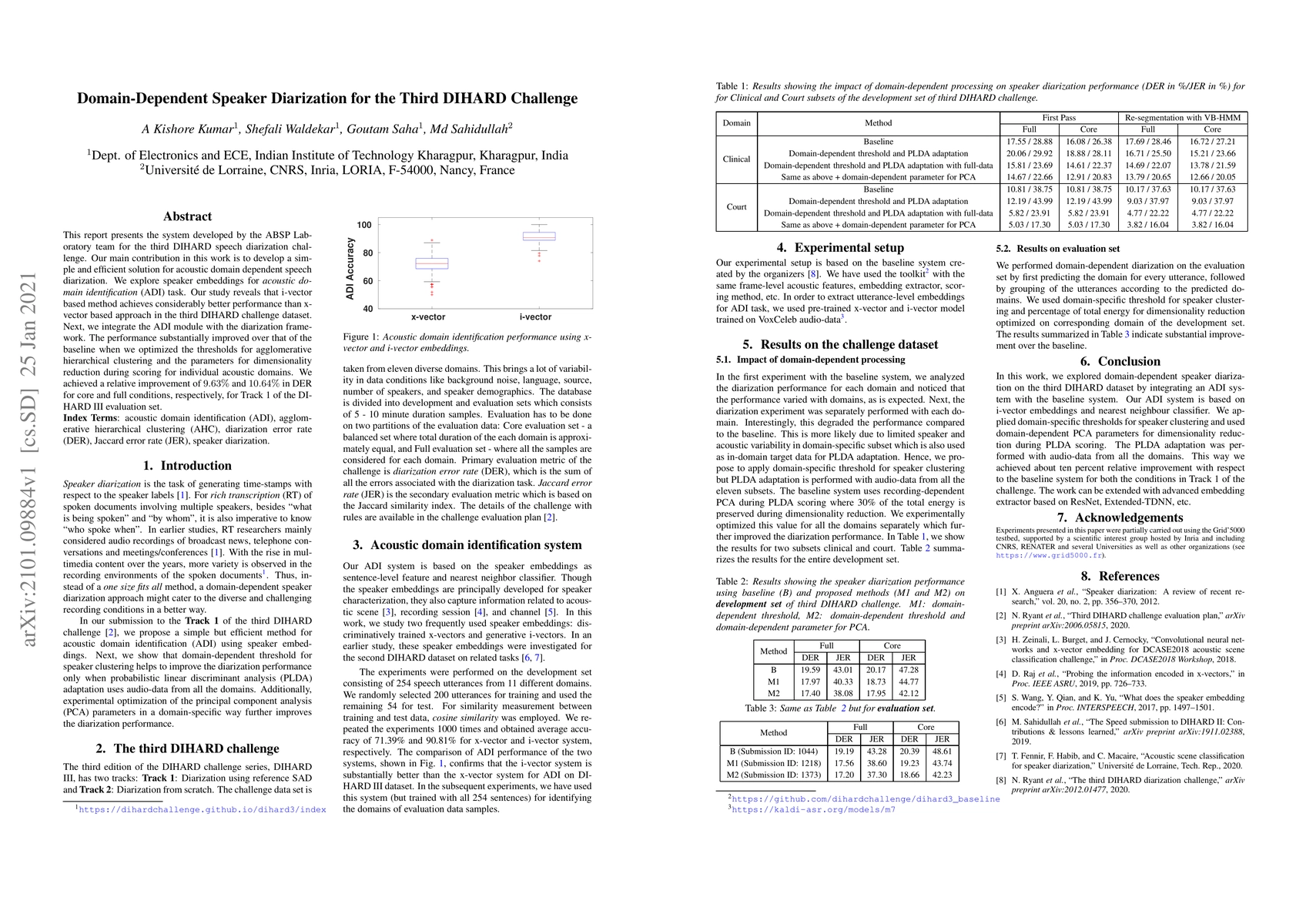This report presents the system developed by the ABSP Laboratory team for the third DIHARD speech diarization challenge. Our main contribution in this work is to develop a simple and efficient solution for acoustic domain dependent speech diarization. We explore speaker embeddings for \emph{acoustic domain identification} (ADI) task. Our study reveals that i-vector based method achieves considerably better performance than x-vector based approach in the third DIHARD challenge dataset. Next, we integrate the ADI module with the diarization framework. The performance substantially improved over that of the baseline when we optimized the thresholds for agglomerative hierarchical clustering and the parameters for dimensionality reduction during scoring for individual acoustic domains. We achieved a relative improvement of $9.63\%$ and $10.64\%$ in DER for core and full conditions, respectively, for Track 1 of the DIHARD III evaluation set.