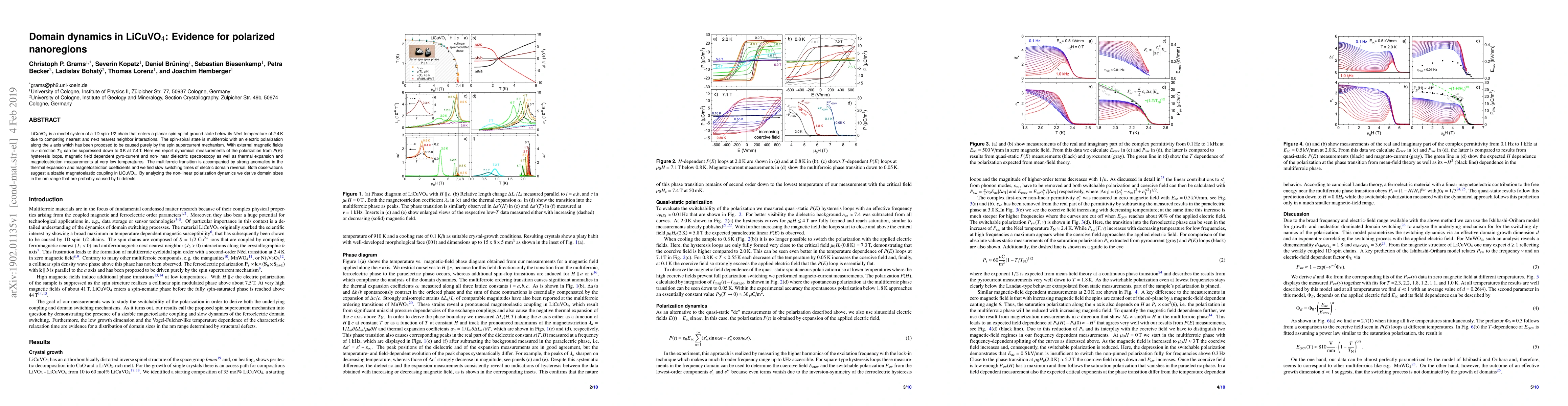 LiCuVO$_4$ is a model system of a 1D spin-1/2 chain that enters a planar spin-spiral ground state below its N\'eel temperature of 2.4 K due to competing nearest and next nearest neighbor interactions. The spin-spiral state is multiferroic with an electric polarization along the a axis which has been proposed to be caused purely by the spin supercurrent mechanism. With external magnetic fields in c direction T$_N$ can be suppressed down to 0 K at 7.4 T. Here we report dynamical measurements of the polarization from P(E)-hysteresis loops, magnetic field dependent pyro-current and non-linear dielectric spectroscopy as well as thermal expansion and magnetostriction measurements at very low temperatures. The multiferroic transition is accompanied by strong anomalies in the thermal expansion and magnetostriction coefficients and we find slow switching times of electric domain reversal. Both observations suggest a sizable magnetoelastic coupling in LiCuVO$_4$. By analyzing the non-linear polarization dynamics we derive domain sizes in the nm range that are probably caused by Li defects.