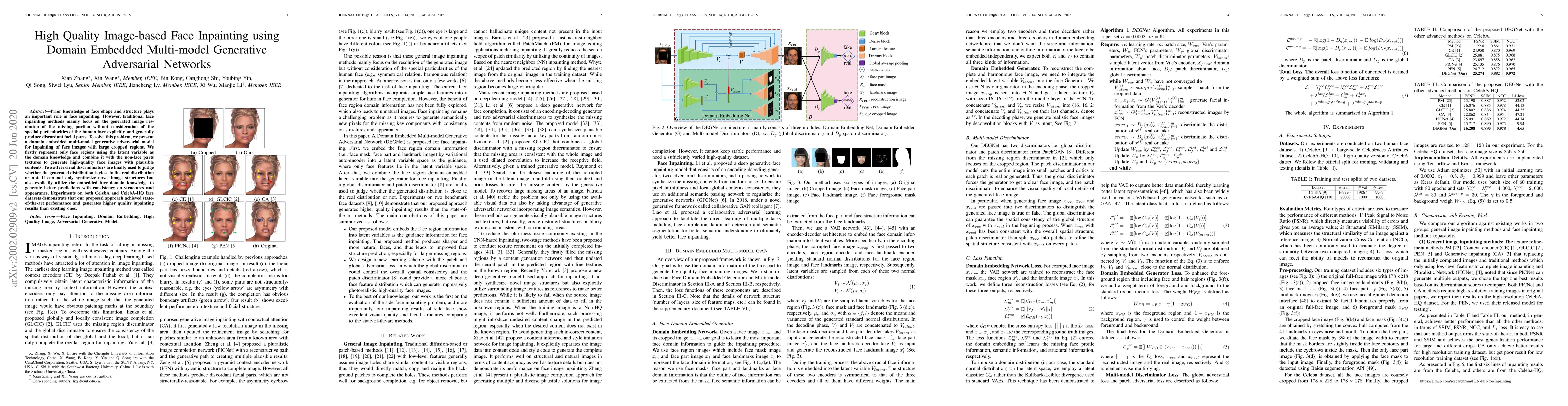 This paper proposes a domain embedded multi-model GAN for image-based face inpainting that leverages face shape and structure knowledge to generate high-quality, consistent face images with large missing regions. The method achieves state-of-the-art performance on CelebA and CelebA-HQ datasets.