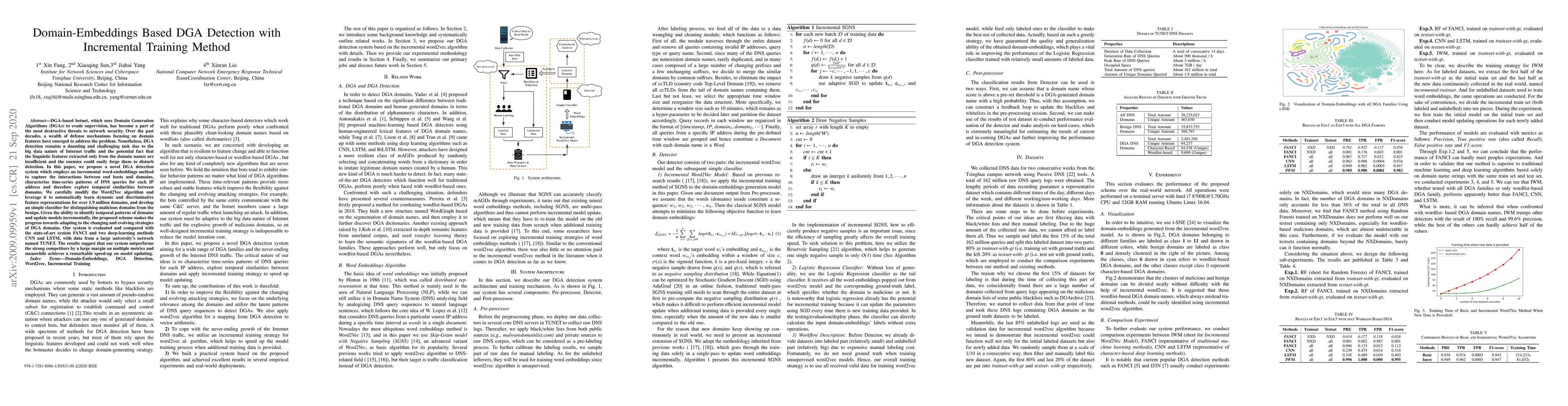 This research introduces a novel DGA detection system using an incremental word-embeddings method to capture interactions between end hosts and domains, and to characterize time-series patterns of DNS queries. The proposed system modifies the Word2Vec algorithm to learn dynamic features from over 1.9 million domains and outperforms state-of-the-art systems in detection accuracy and model updating speed. For more details, refer to the original paper.