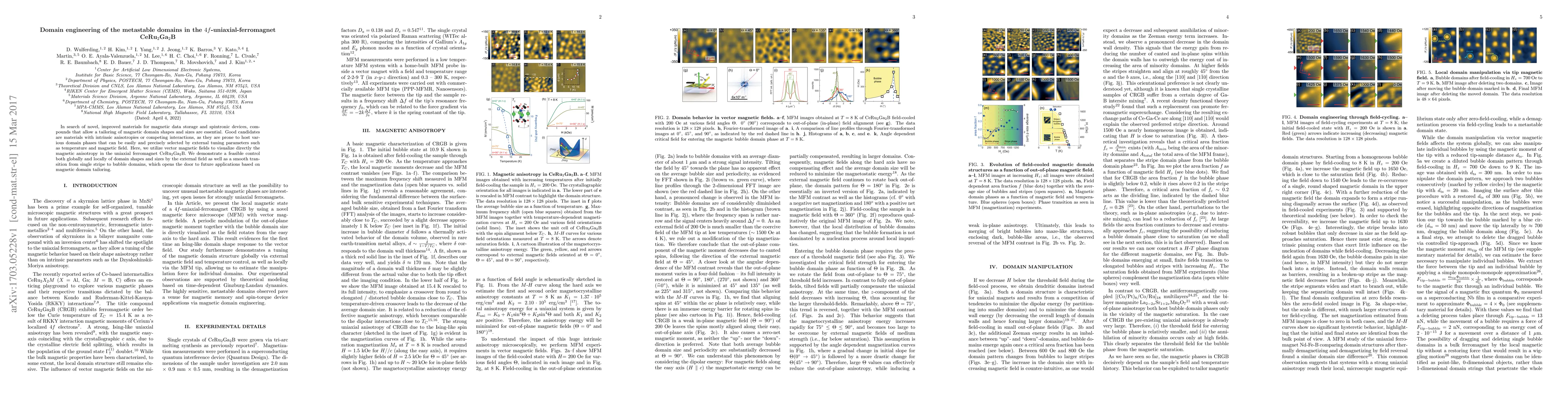 In search of novel, improved materials for magnetic data storage and spintronic devices, compounds that allow a tailoring of magnetic domain shapes and sizes are essential. Good candidates are materials with intrinsic anisotropies or competing interactions, as they are prone to host various domain phases that can be easily and precisely selected by external tuning parameters such as temperature and magnetic field. Here, we utilize vector magnetic fields to visualize directly the magnetic anisotropy in the uniaxial ferromagnet CeRu$_2$Ga$_2$B. We demonstrate a feasible control both globally and locally of domain shapes and sizes by the external field as well as a smooth transition from single stripe to bubble domains, which opens the door to future applications based on magnetic domain tailoring.