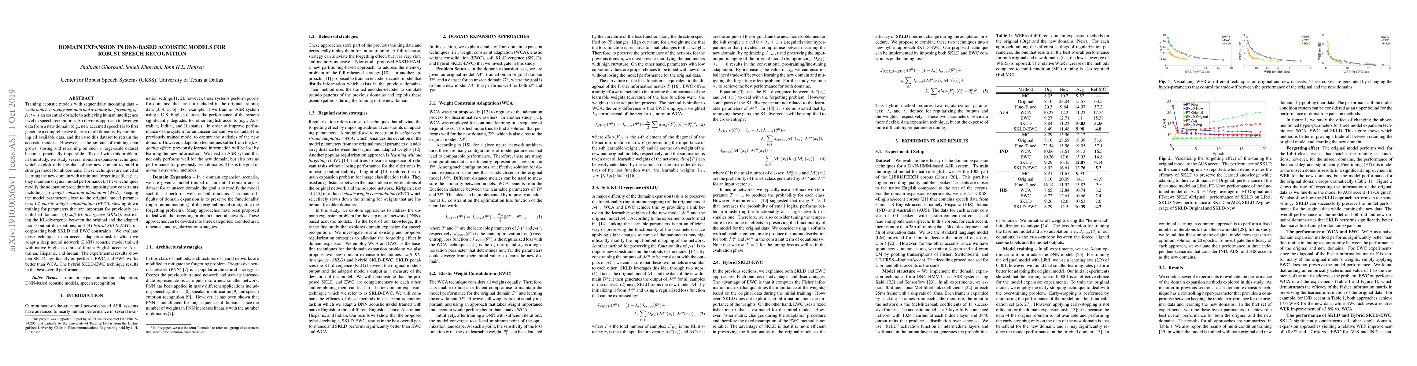 Training acoustic models with sequentially incoming data -- while both leveraging new data and avoiding the forgetting effect-- is an essential obstacle to achieving human intelligence level in speech recognition. An obvious approach to leverage data from a new domain (e.g., new accented speech) is to first generate a comprehensive dataset of all domains, by combining all available data, and then use this dataset to retrain the acoustic models. However, as the amount of training data grows, storing and retraining on such a large-scale dataset becomes practically impossible. To deal with this problem, in this study, we study several domain expansion techniques which exploit only the data of the new domain to build a stronger model for all domains. These techniques are aimed at learning the new domain with a minimal forgetting effect (i.e., they maintain original model performance). These techniques modify the adaptation procedure by imposing new constraints including (1) weight constraint adaptation (WCA): keeping the model parameters close to the original model parameters; (2) elastic weight consolidation (EWC): slowing down training for parameters that are important for previously established domains; (3) soft KL-divergence (SKLD): restricting the KL-divergence between the original and the adapted model output distributions; and (4) hybrid SKLD-EWC: incorporating both SKLD and EWC constraints. We evaluate these techniques in an accent adaptation task in which we adapt a deep neural network (DNN) acoustic model trained with native English to three different English accents: Australian, Hispanic, and Indian. The experimental results show that SKLD significantly outperforms EWC, and EWC works better than WCA. The hybrid SKLD-EWC technique results in the best overall performance.