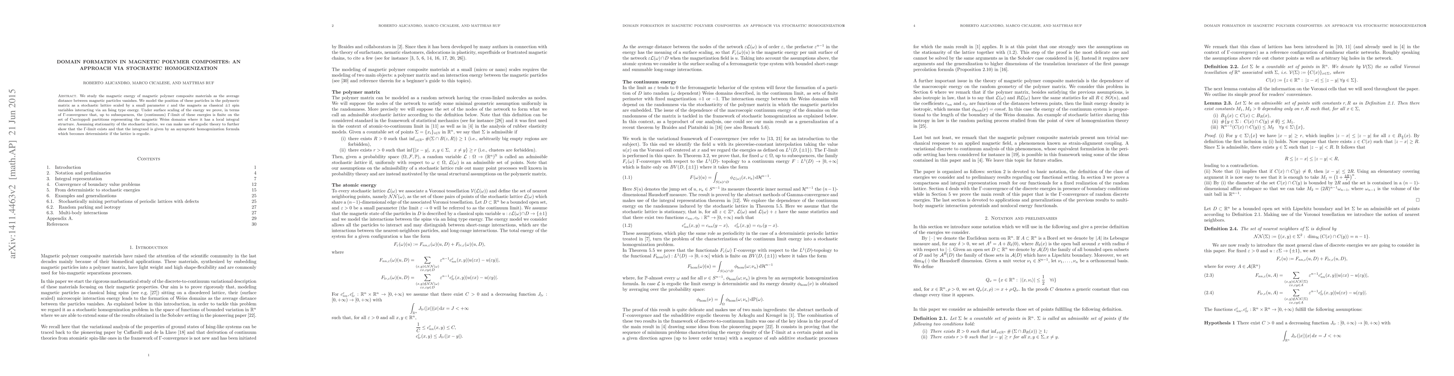 We study the magnetic energy of magnetic polymer composite materials as the average distance between magnetic particles vanishes. We model the position of these particles in the polymeric matrix as a stochastic lattice scaled by a small parameter $\varepsilon$ and the magnets as classical $\pm 1$ spin variables interacting via an Ising type energy. Under surface scaling of the energy we prove, in terms of $\Gamma$-convergence that, up to subsequences, the (continuum) $\Gamma$-limit of these energies is finite on the set of Caccioppoli partitions representing the magnetic Weiss domains where it has a local integral structure. Assuming stationarity of the stochastic lattice, we can make use of ergodic theory to further show that the $\Gamma$-limit exists and that the integrand is given by an asymptotic homogenization formula which becomes deterministic if the lattice is ergodic.