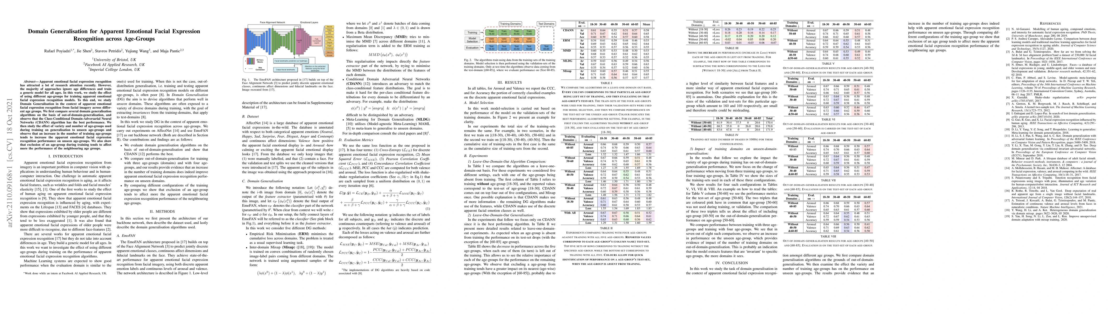 This paper investigates the impact of age-group differences on apparent emotional facial expression recognition using Domain Generalisation techniques. The study finds that Class-Conditional Domain-Adversarial Neural Networks (CDANN) performs best, and increasing the number of training age-groups enhances model performance on unseen age-groups, with the exclusion of an age-group during training disproportionately affecting neighboring age groups.