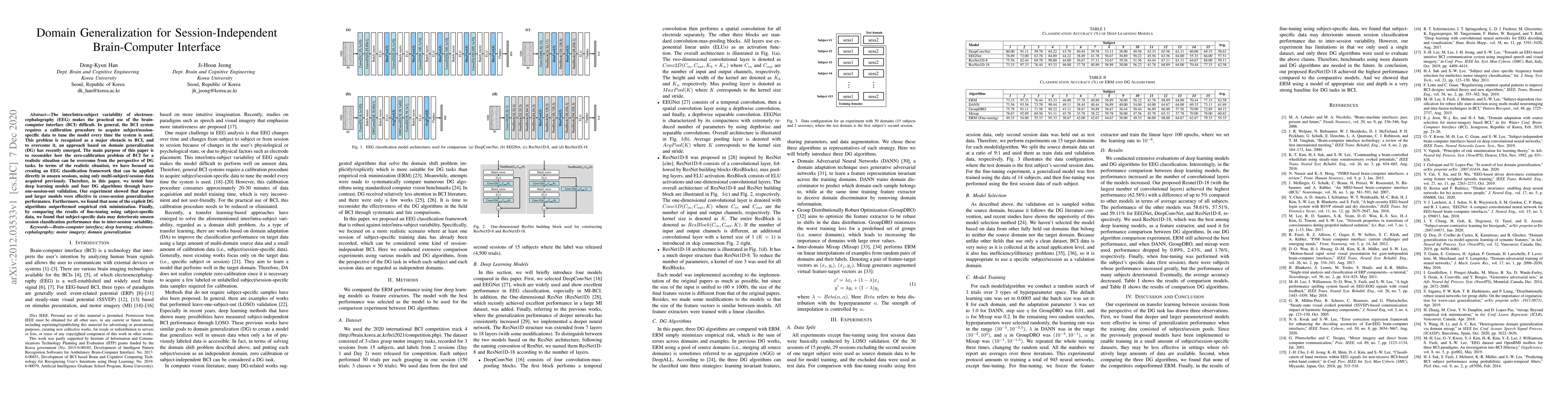 A study explored domain generalization for brain-computer interfaces to overcome calibration issues caused by subject/session variability in EEG data. Deeper models outperformed others in cross-session generalization performance.