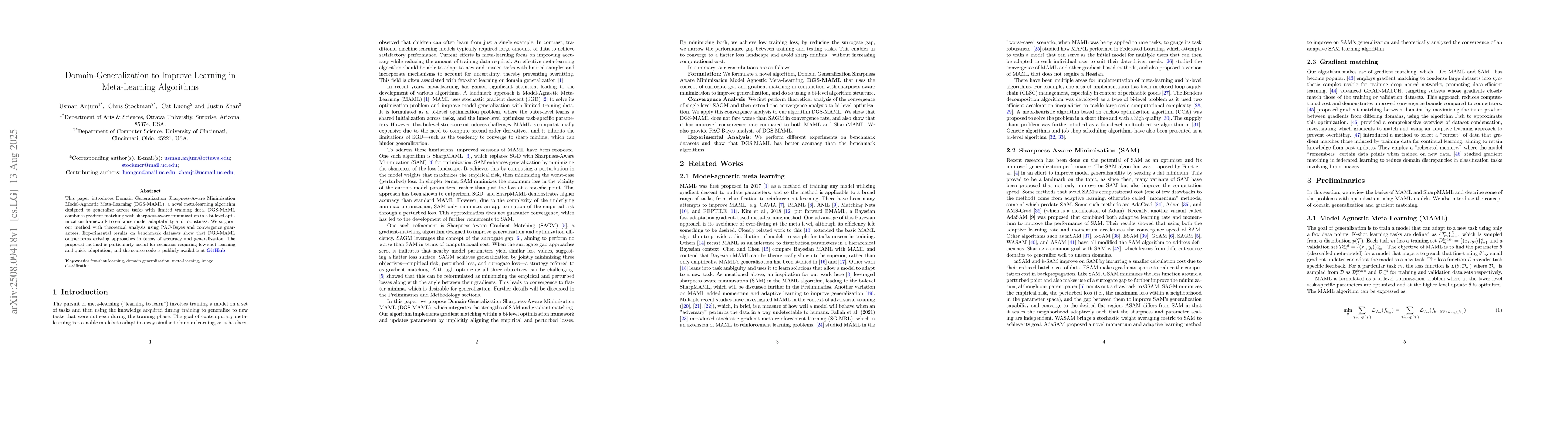This paper introduces Domain Generalization Sharpness-Aware Minimization Model-Agnostic Meta-Learning (DGS-MAML), a novel meta-learning algorithm designed to generalize across tasks with limited training data. DGS-MAML combines gradient matching with sharpness-aware minimization in a bi-level optimization framework to enhance model adaptability and robustness. We support our method with theoretical analysis using PAC-Bayes and convergence guarantees. Experimental results on benchmark datasets show that DGS-MAML outperforms existing approaches in terms of accuracy and generalization. The proposed method is particularly useful for scenarios requiring few-shot learning and quick adaptation, and the source code is publicly available at GitHub.