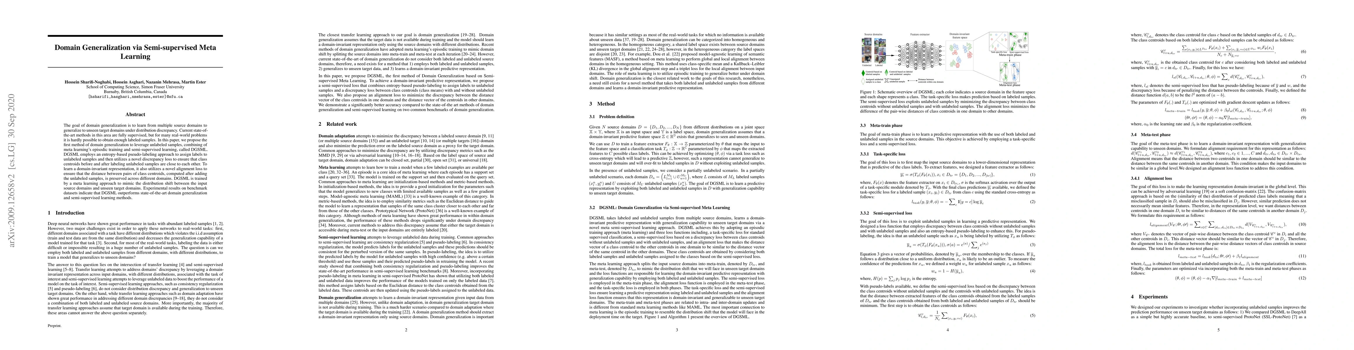 The goal of domain generalization is to learn from multiple source domains to generalize to unseen target domains under distribution discrepancy. Current state-of-the-art methods in this area are fully supervised, but for many real-world problems it is hardly possible to obtain enough labeled samples. In this paper, we propose the first method of domain generalization to leverage unlabeled samples, combining of meta learning's episodic training and semi-supervised learning, called DGSML. DGSML employs an entropy-based pseudo-labeling approach to assign labels to unlabeled samples and then utilizes a novel discrepancy loss to ensure that class centroids before and after labeling unlabeled samples are close to each other. To learn a domain-invariant representation, it also utilizes a novel alignment loss to ensure that the distance between pairs of class centroids, computed after adding the unlabeled samples, is preserved across different domains. DGSML is trained by a meta learning approach to mimic the distribution shift between the input source domains and unseen target domains. Experimental results on benchmark datasets indicate that DGSML outperforms state-of-the-art domain generalization and semi-supervised learning methods.