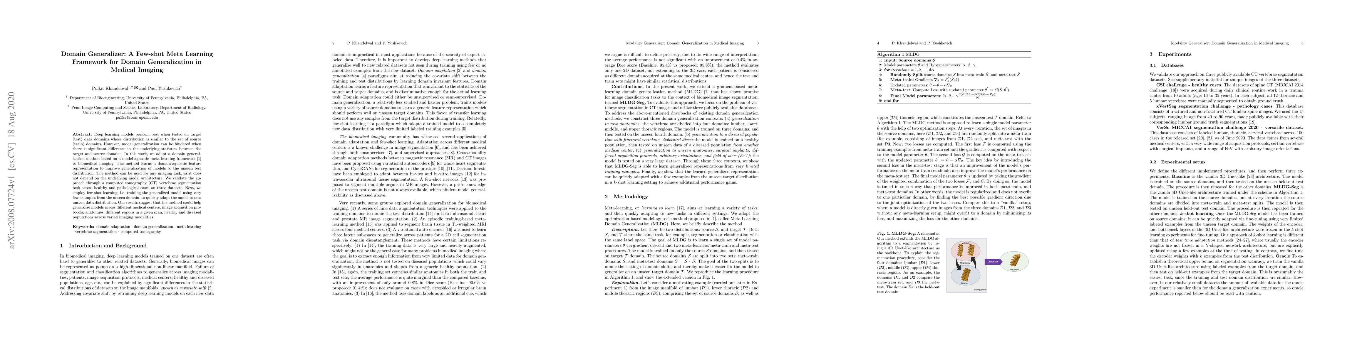 Deep learning models perform best when tested on target (test) data domains whose distribution is similar to the set of source (train) domains. However, model generalization can be hindered when there is significant difference in the underlying statistics between the target and source domains. In this work, we adapt a domain generalization method based on a model-agnostic meta-learning framework to biomedical imaging. The method learns a domain-agnostic feature representation to improve generalization of models to the unseen test distribution. The method can be used for any imaging task, as it does not depend on the underlying model architecture. We validate the approach through a computed tomography (CT) vertebrae segmentation task across healthy and pathological cases on three datasets. Next, we employ few-shot learning, i.e. training the generalized model using very few examples from the unseen domain, to quickly adapt the model to new unseen data distribution. Our results suggest that the method could help generalize models across different medical centers, image acquisition protocols, anatomies, different regions in a given scan, healthy and diseased populations across varied imaging modalities.