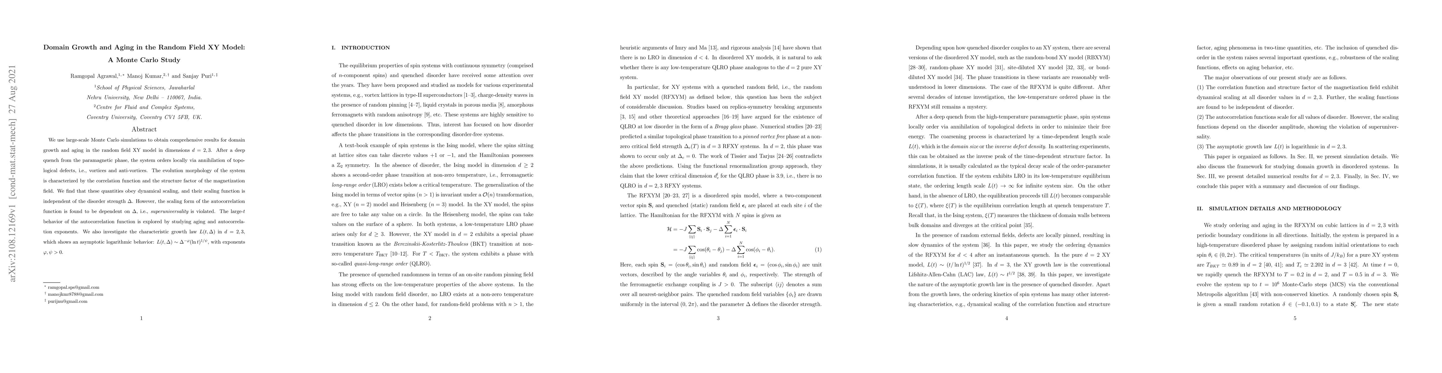 This research uses Monte Carlo simulations to study domain growth and aging in the random field XY model in dimensions 2 and 3. It reveals dynamical scaling and logarithmic growth laws but finds that superuniversality is violated due to dependence on disorder strength.