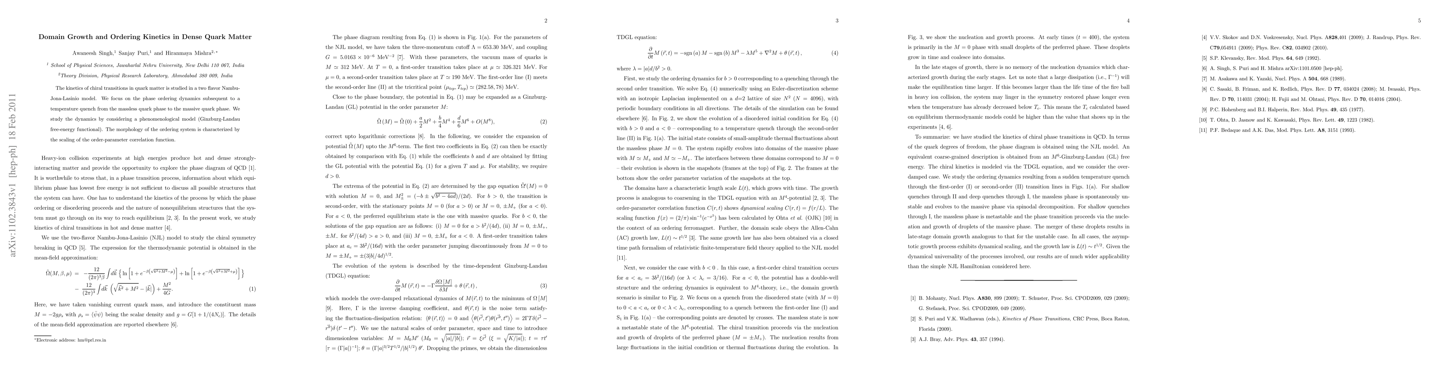 This paper investigates the kinetics of chiral transitions in dense quark matter using a two-flavor Nambu-Jona-Lasinio model, focusing on the phase ordering dynamics after a temperature quench. The study employs a Ginzburg-Landau free-energy functional to characterize the morphology and scaling behavior of the order-parameter correlation function.