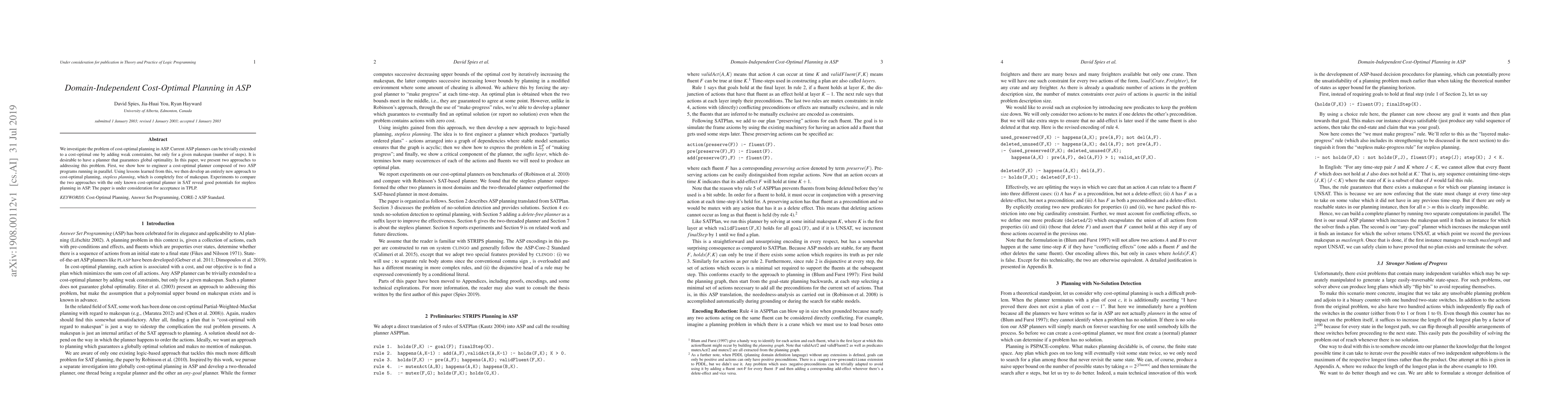 We investigate the problem of cost-optimal planning in ASP. Current ASP planners can be trivially extended to a cost-optimal one by adding weak constraints, but only for a given makespan (number of steps). It is desirable to have a planner that guarantees global optimality. In this paper, we present two approaches to addressing this problem. First, we show how to engineer a cost-optimal planner composed of two ASP programs running in parallel. Using lessons learned from this, we then develop an entirely new approach to cost-optimal planning, stepless planning, which is completely free of makespan. Experiments to compare the two approaches with the only known cost-optimal planner in SAT reveal good potentials for stepless planning in ASP. The paper is under consideration for acceptance in TPLP.
