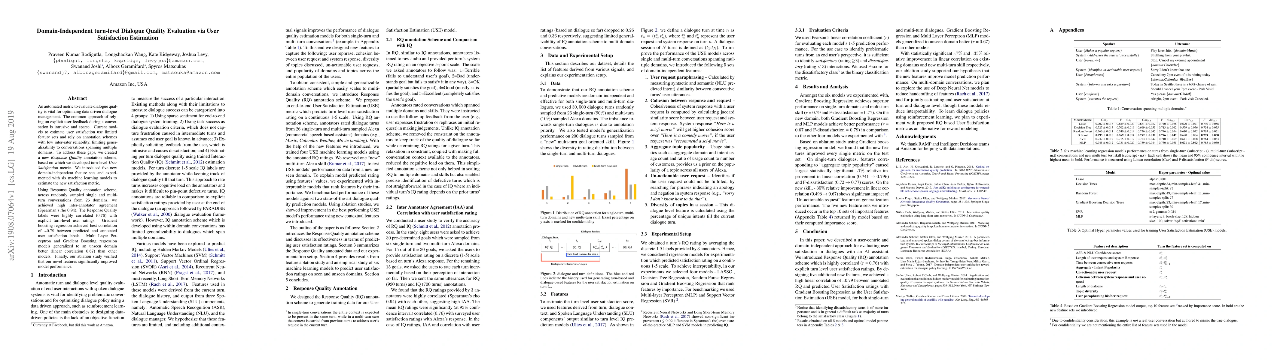 This paper proposes a domain-independent metric for evaluating dialogue quality based on a new Response Quality annotation scheme and a turn-level User Satisfaction metric. Gradient boosting regression and Multi Layer Perceptron models showed the best performance in estimating user satisfaction across diverse domains.