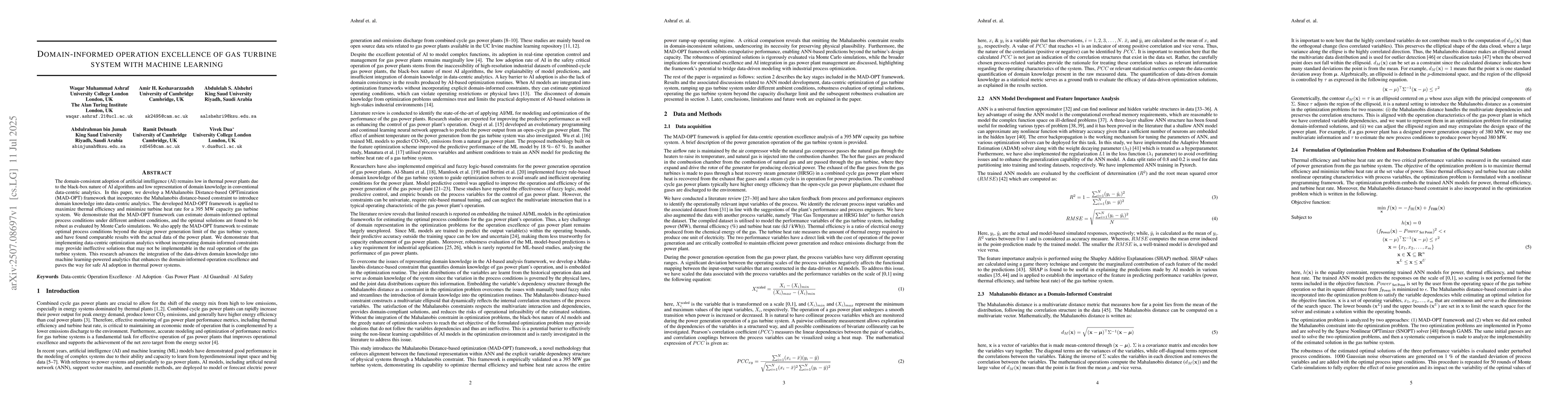The domain-consistent adoption of artificial intelligence (AI) remains low in thermal power plants due to the black-box nature of AI algorithms and low representation of domain knowledge in conventional data-centric analytics. In this paper, we develop a MAhalanobis Distance-based OPTimization (MAD-OPT) framework that incorporates the Mahalanobis distance-based constraint to introduce domain knowledge into data-centric analytics. The developed MAD-OPT framework is applied to maximize thermal efficiency and minimize turbine heat rate for a 395 MW capacity gas turbine system. We demonstrate that the MAD-OPT framework can estimate domain-informed optimal process conditions under different ambient conditions, and the optimal solutions are found to be robust as evaluated by Monte Carlo simulations. We also apply the MAD-OPT framework to estimate optimal process conditions beyond the design power generation limit of the gas turbine system, and have found comparable results with the actual data of the power plant. We demonstrate that implementing data-centric optimization analytics without incorporating domain-informed constraints may provide ineffective solutions that may not be implementable in the real operation of the gas turbine system. This research advances the integration of the data-driven domain knowledge into machine learning-powered analytics that enhances the domain-informed operation excellence and paves the way for safe AI adoption in thermal power systems.