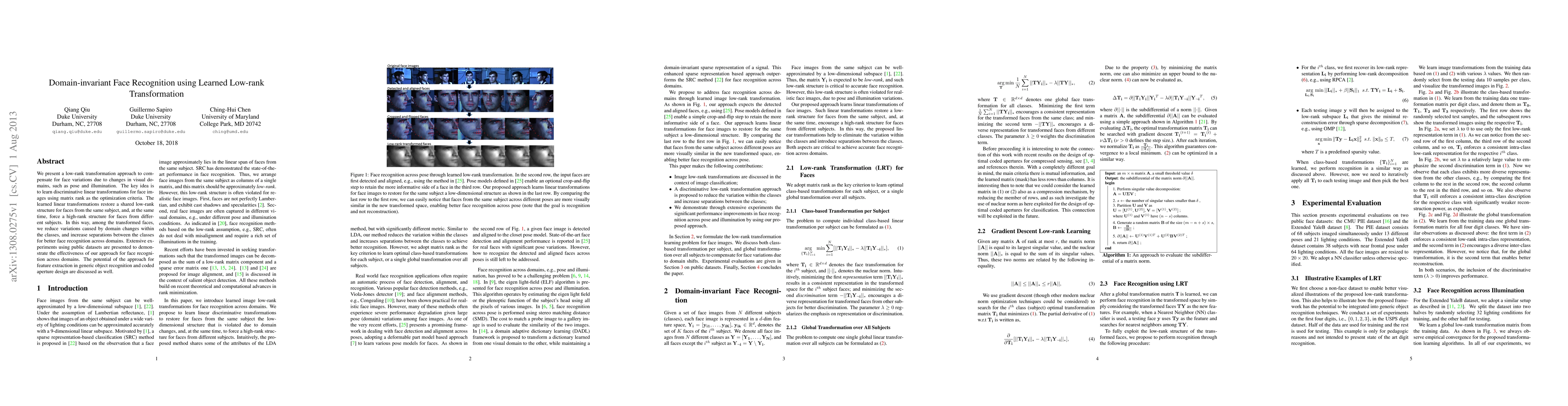This paper proposes a low-rank transformation method to enhance domain-invariant face recognition by learning linear transformations that minimize intra-class variations and maximize inter-class separations. Experiments show its effectiveness for cross-domain face recognition and potential applications in object recognition and coded aperture design.