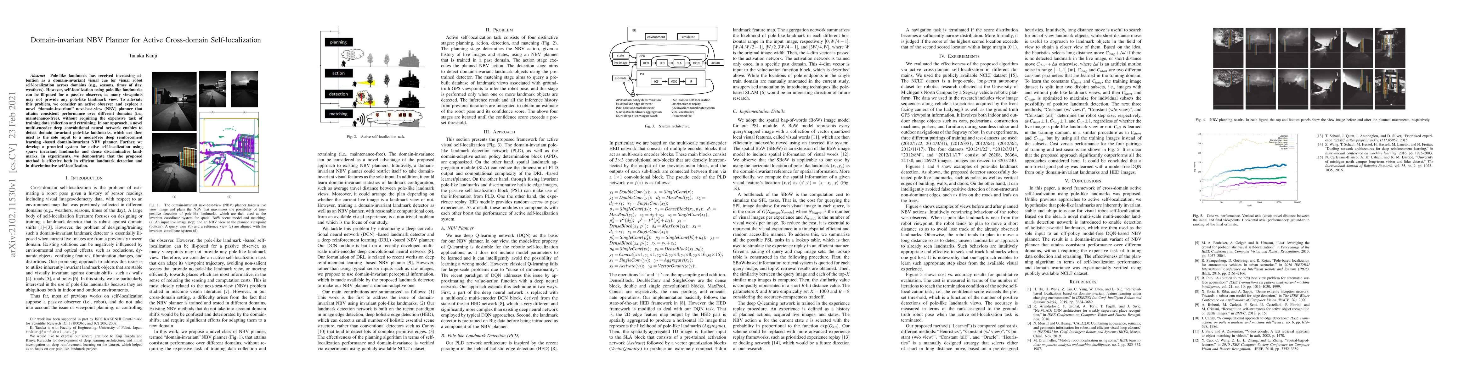Pole-like landmark has received increasing attention as a domain-invariant visual cue for visual robot self-localization across domains (e.g., seasons, times of day, weathers). However, self-localization using pole-like landmarks can be ill-posed for a passive observer, as many viewpoints may not provide any pole-like landmark view. To alleviate this problem, we consider an active observer and explore a novel "domain-invariant" next-best-view (NBV) planner that attains consistent performance over different domains (i.e., maintenance-free), without requiring the expensive task of training data collection and retraining. In our approach, a novel multi-encoder deep convolutional neural network enables to detect domain invariant pole-like landmarks, which are then used as the sole input to a model-free deep reinforcement learning -based domain-invariant NBV planner. Further, we develop a practical system for active self-localization using sparse invariant landmarks and dense discriminative landmarks. In experiments, we demonstrate that the proposed method is effective both in efficient landmark detection and in discriminative self-localization.