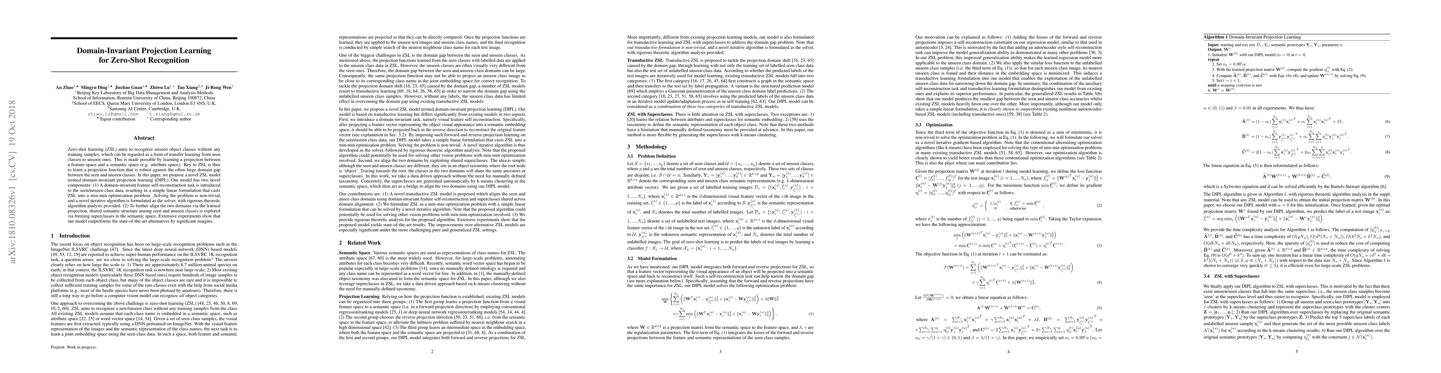 A new zero-shot learning model called domain-invariant projection learning (DIPL) outperforms state-of-the-art alternatives with significant margins by using a novel feature self-reconstruction task and exploring shared semantic structures between seen and unseen classes.
