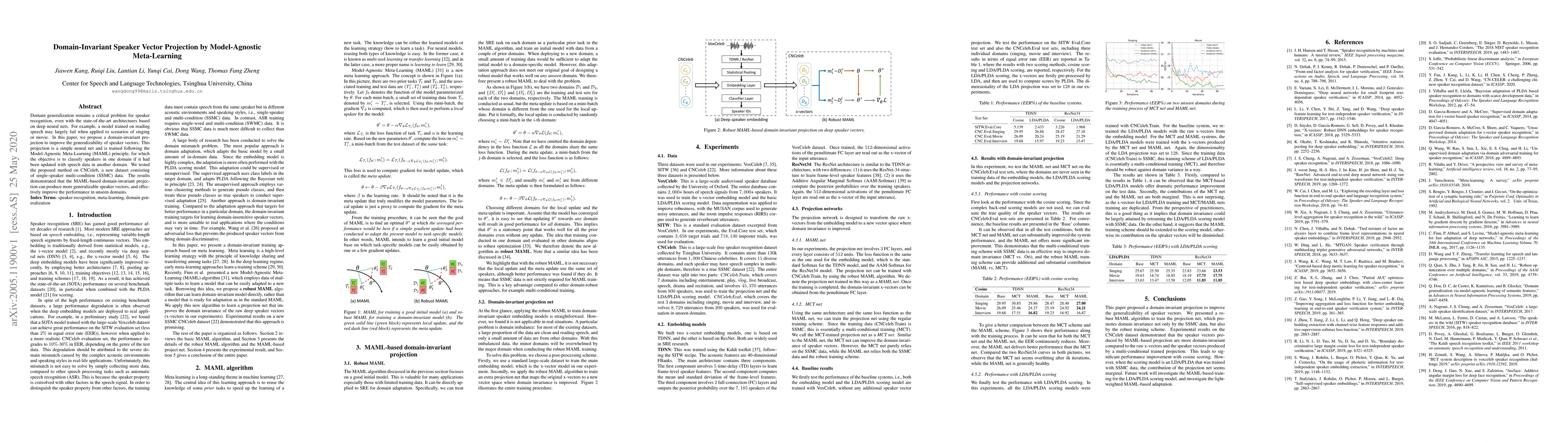 This paper proposes a domain-invariant projection using Model-Agnostic Meta-Learning (MAML) to enhance the generalizability of speaker recognition models across different speech conditions. The method was tested on CNCeleb dataset, showing improved performance in unseen domains.